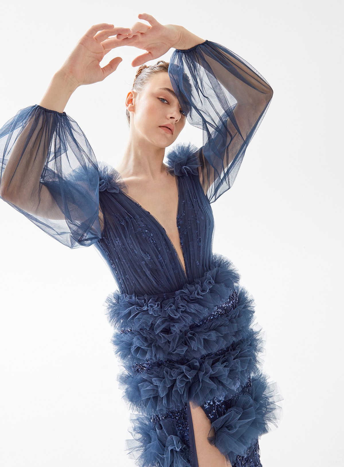 Balloon Sleeved Shoulder Detailed Ruffle Dress with Embellishment