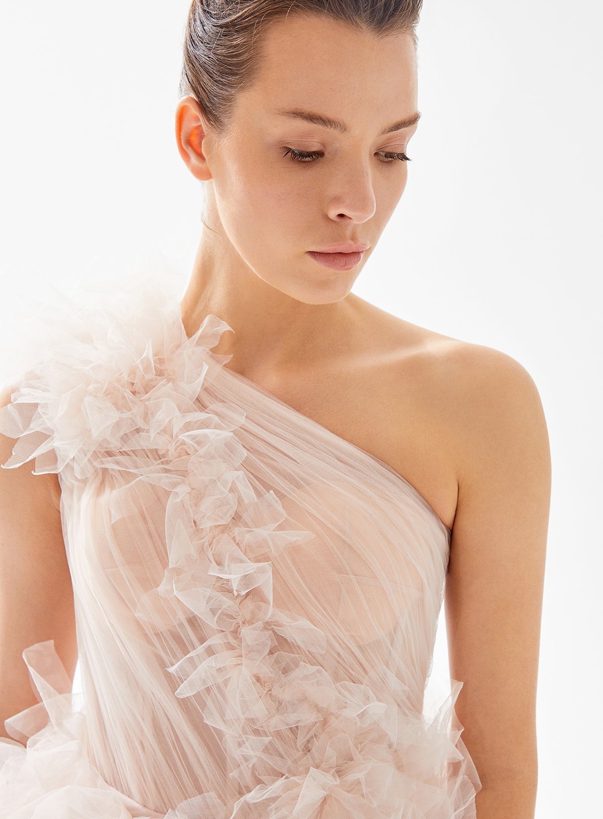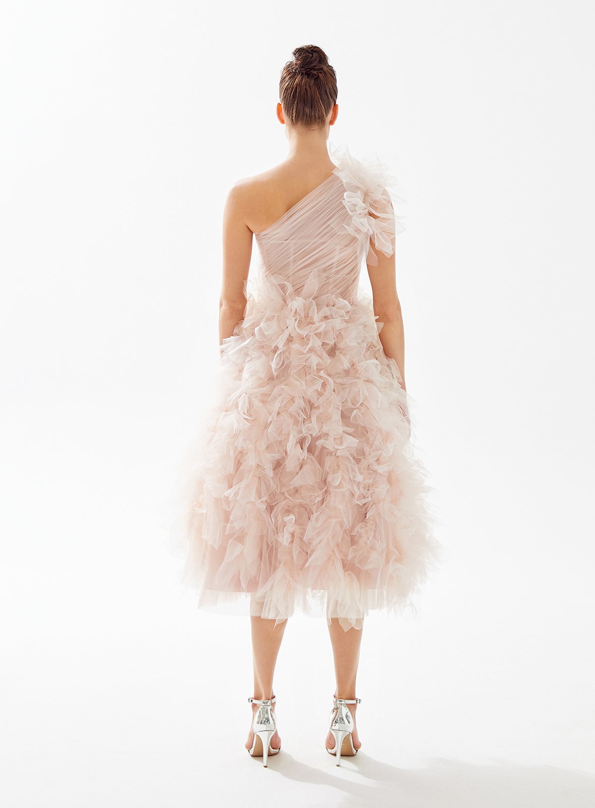 One Shouldered Midi Tulle Dress with Voluminous Ruffle Skirt