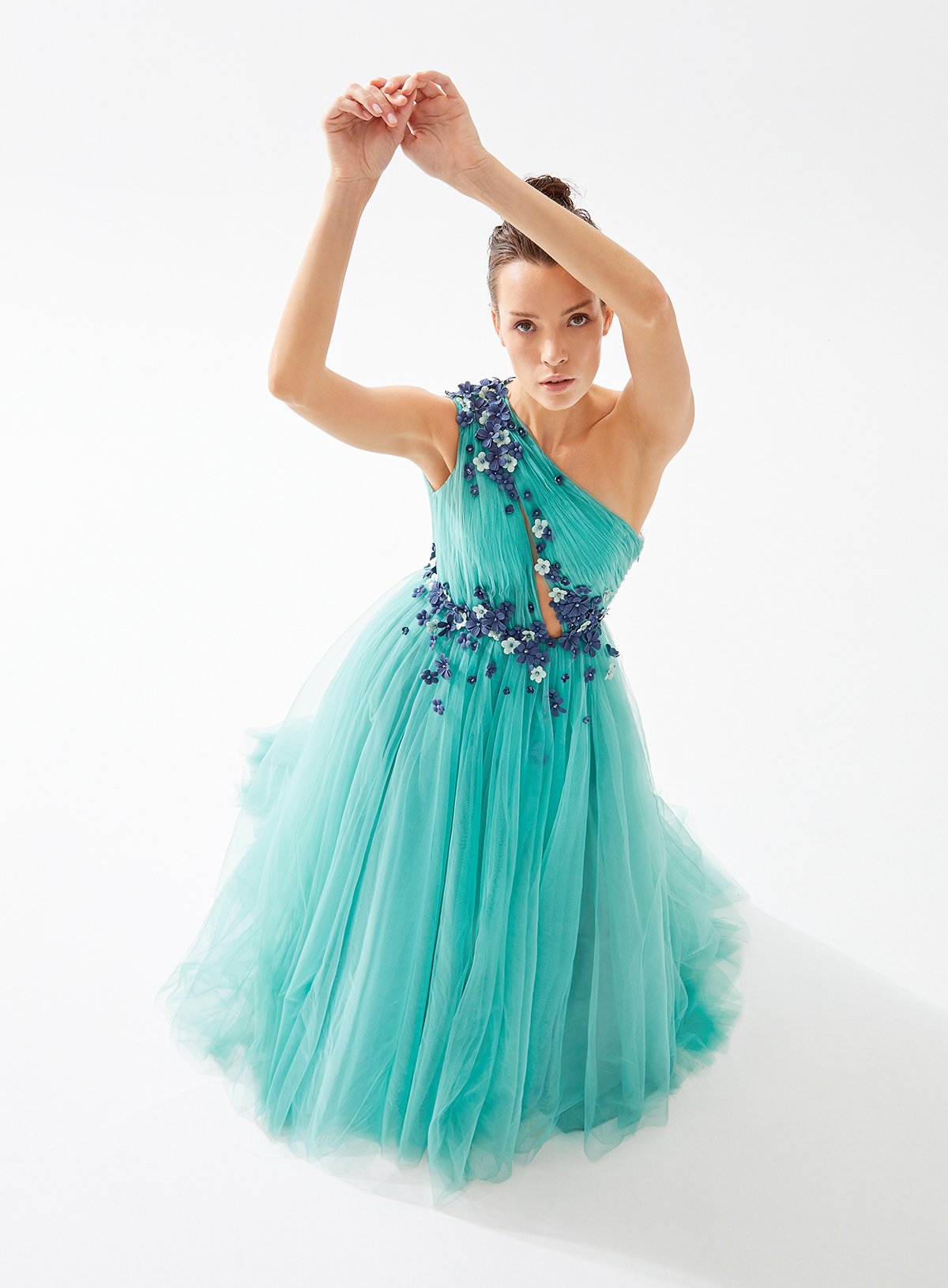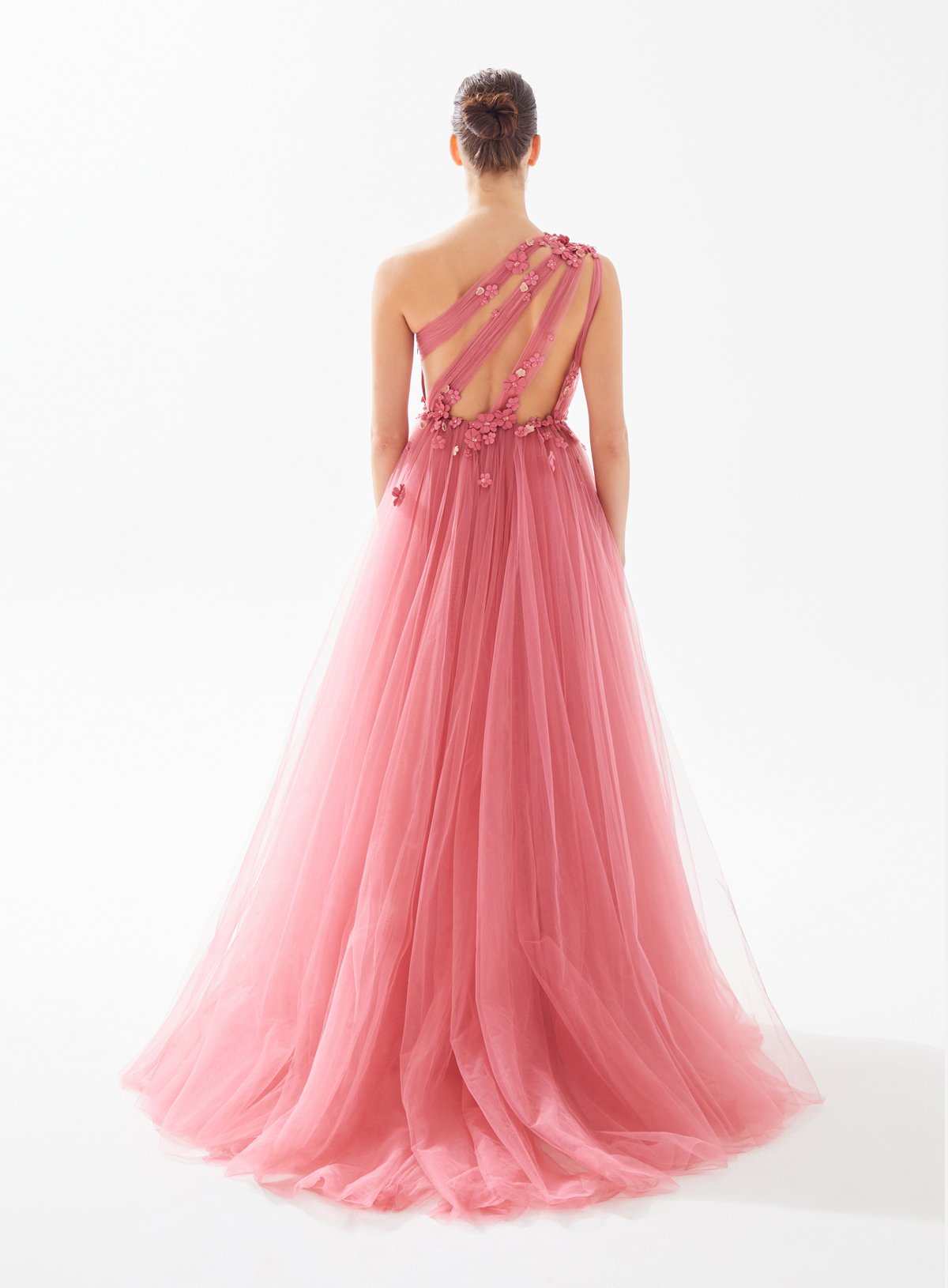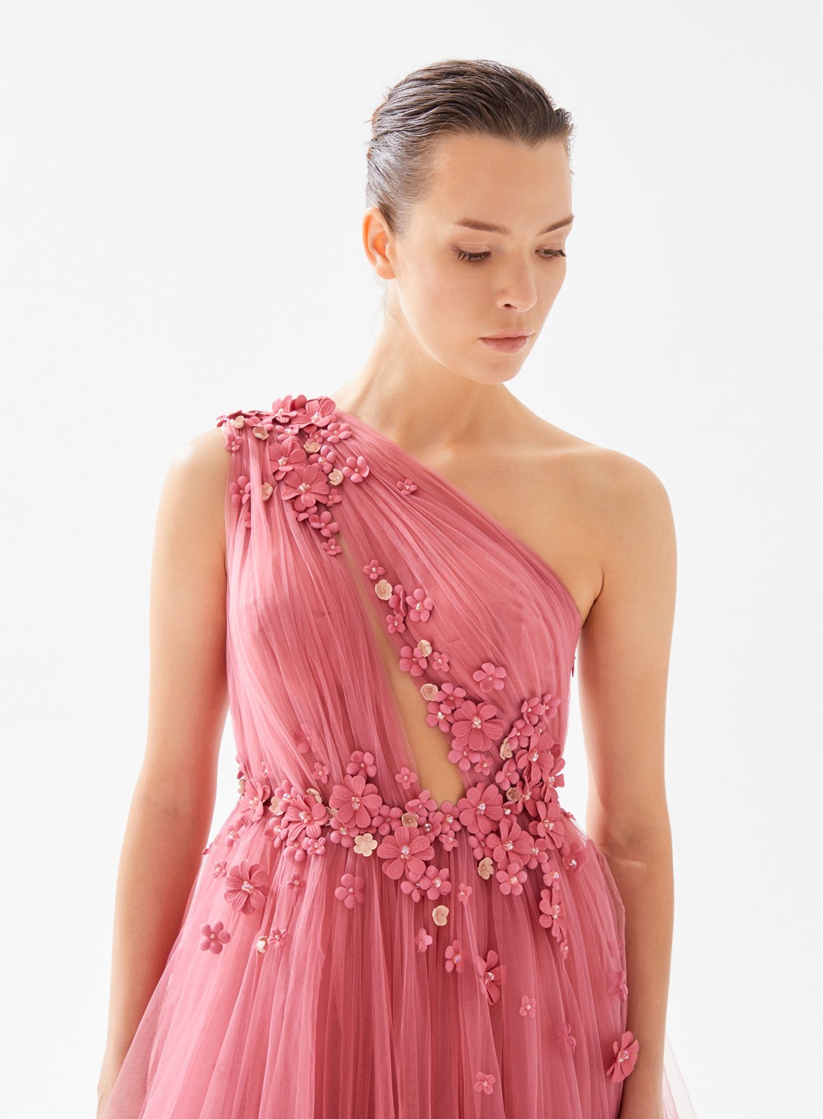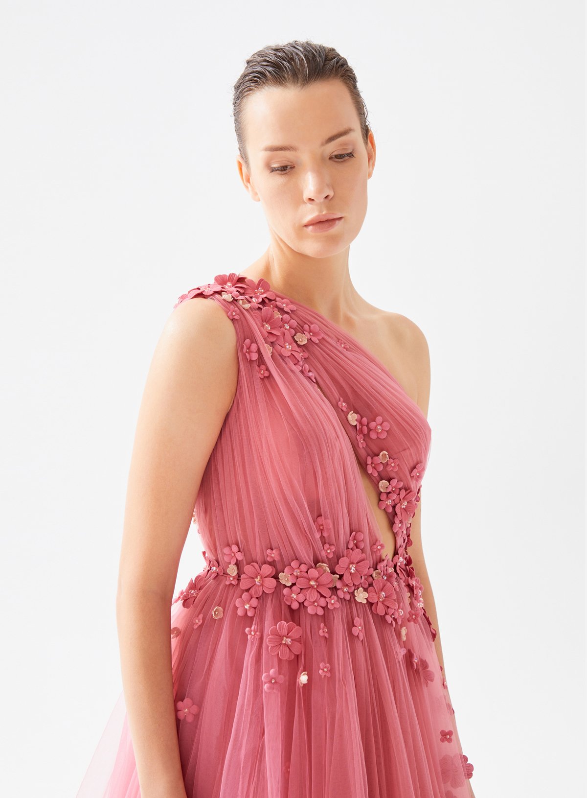 One Shouldered Asymmetrical Cut Out Dress with Fower Embellishment
