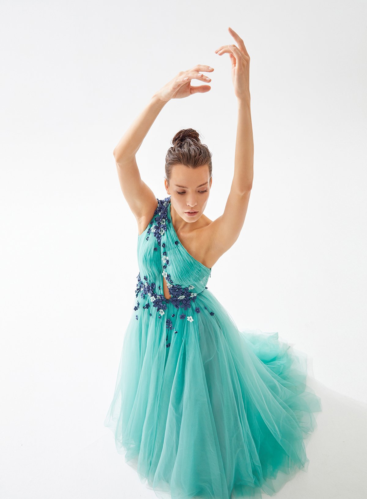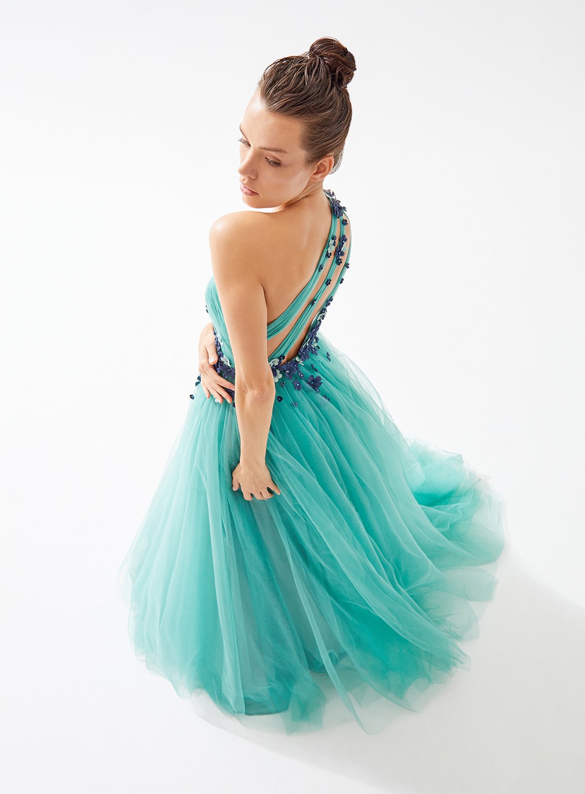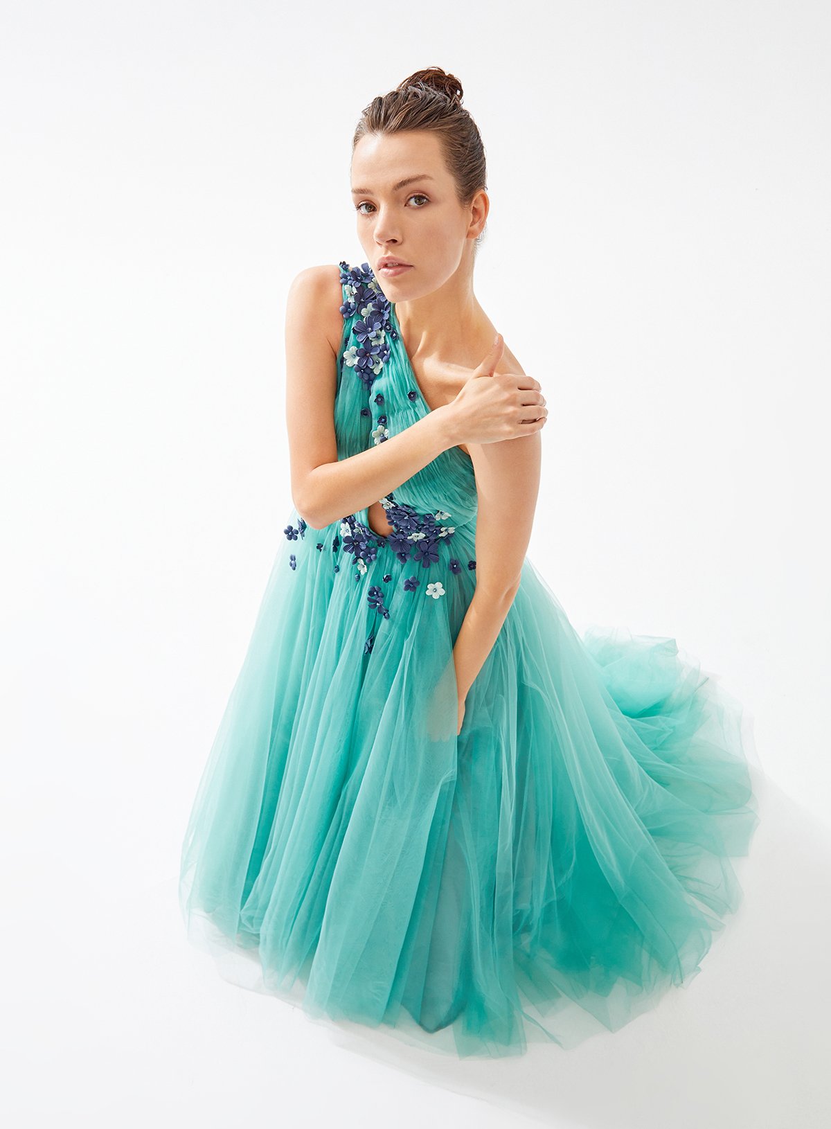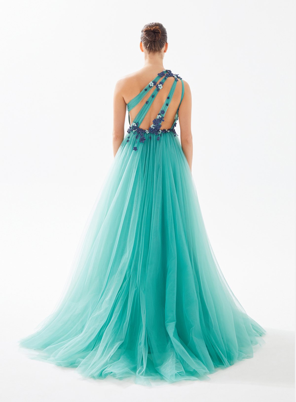 One Shouldered Asymmetrical Cut Out Dress with Fower Embellishment