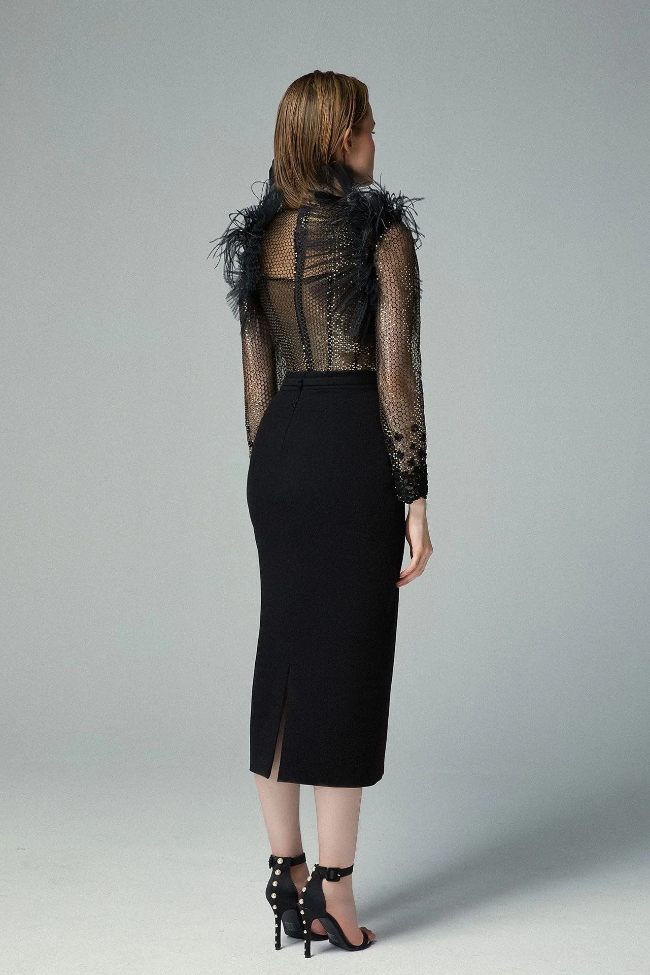 A round neck top made of black net fabric embroidered and sparkled in gold dust shimmering luminous sequins. Feathered on the shoulder and decorated with fluffy dotted motifs on the chest and on the wrist to add excitement. This top is completed with a zipper on the sexy sheer back that look like a corset. This sophisticated top comes in parallel with a crepe midi skirt silhouetted with a fitted belt on the waist, and shows a low back slit.