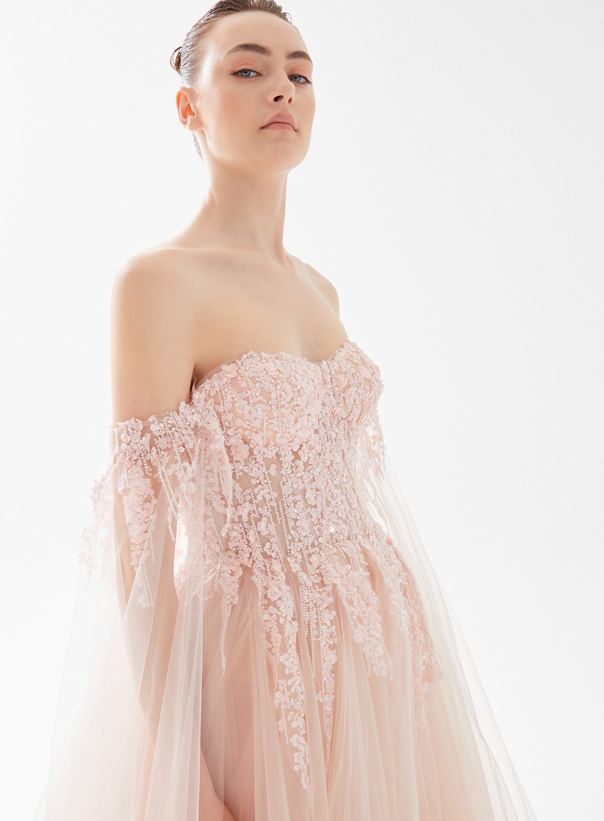 Off Shouldered Maxi Sleeved Embellished Tulle Dress