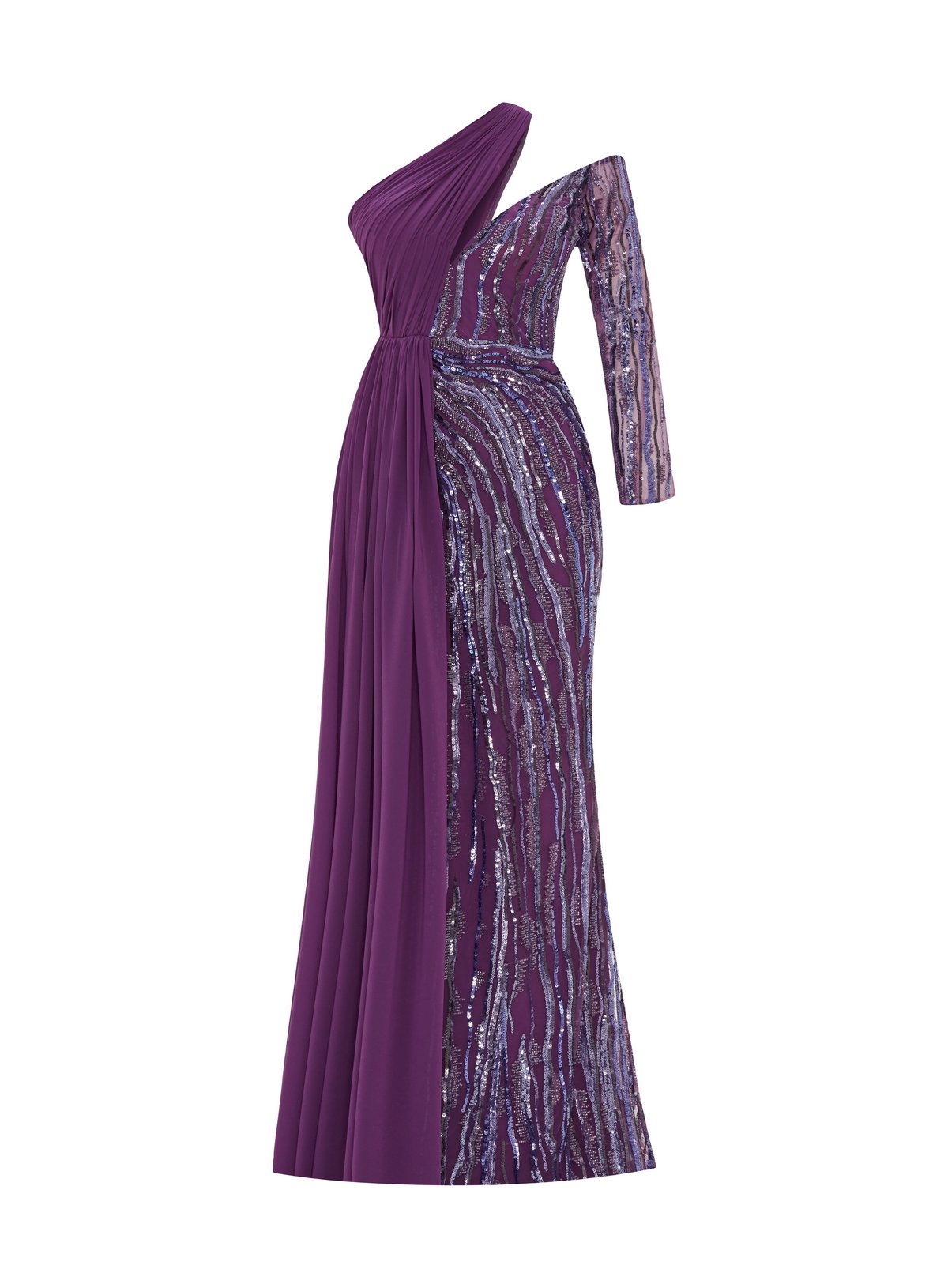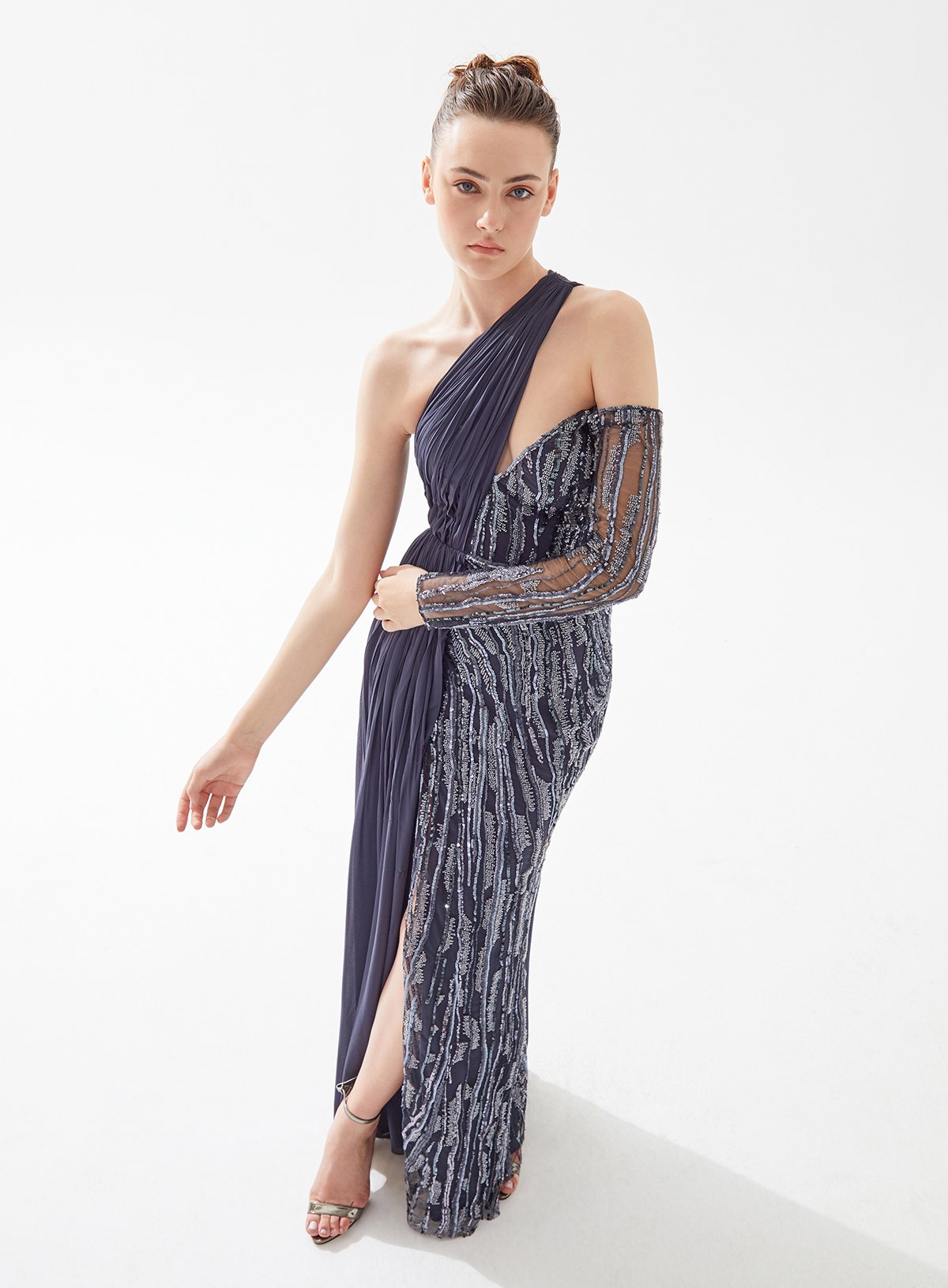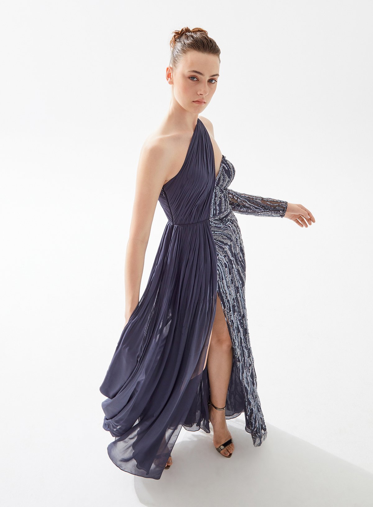 Contrast Asymmetrical Pleated and Embroidered Sress