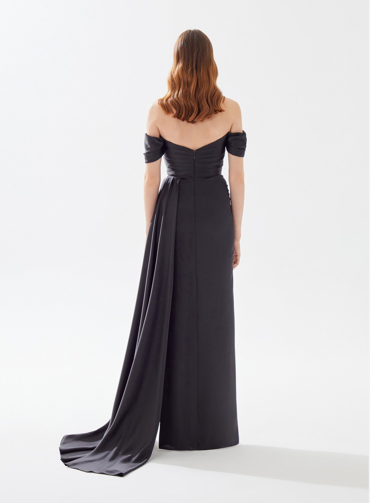 Heart Neck Off Shouldered Taffeta Dress with Drapery and Slit