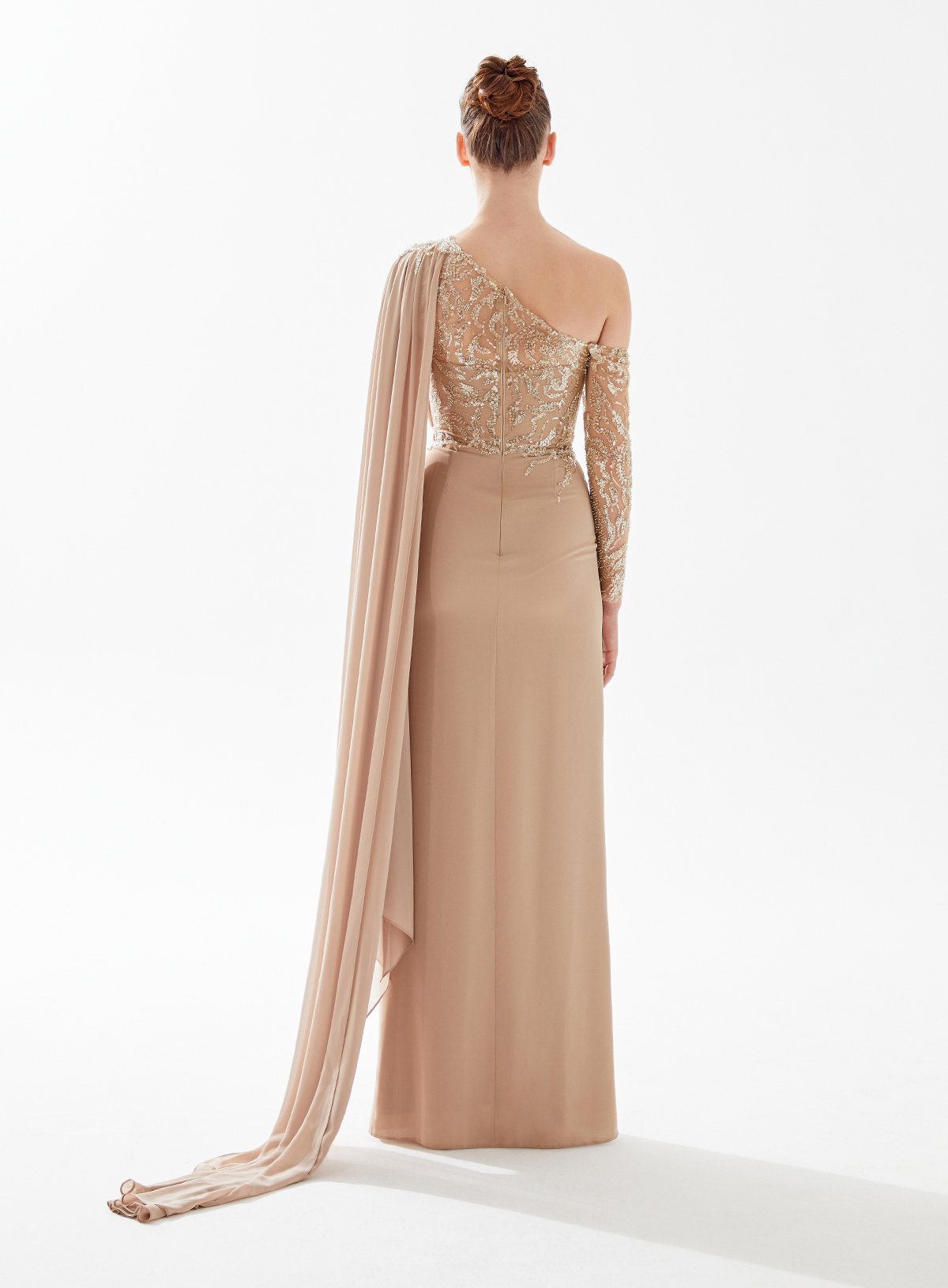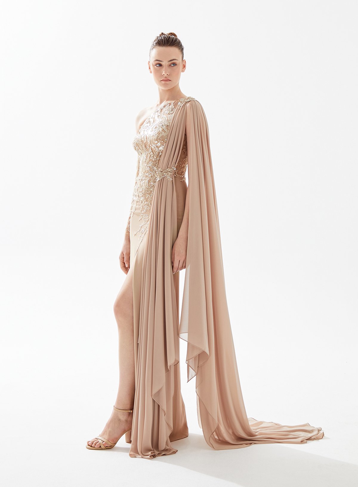 This stunning dress is crafted in luxurious crepe fabric showcasing a sculpted bodice ornate with stunning display of shimmering beadworks that perfectly enhances the gown’s asymmetric neckline and sheer long sleeve while its shoulder cascading drape adds dramatic flair. The solid tone sheath skirt completes a floor-length hem with a captivating front high slit.