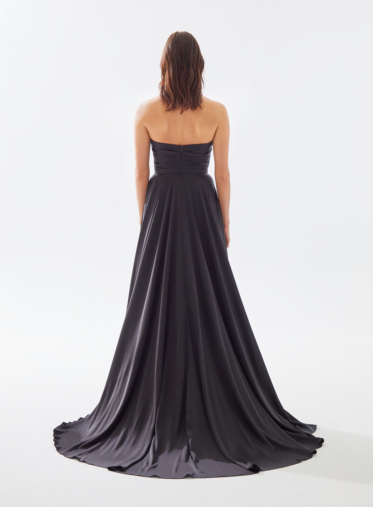 Strapless Embellished Top with Draped Fabric Cover Tulle Dress with Side Slit