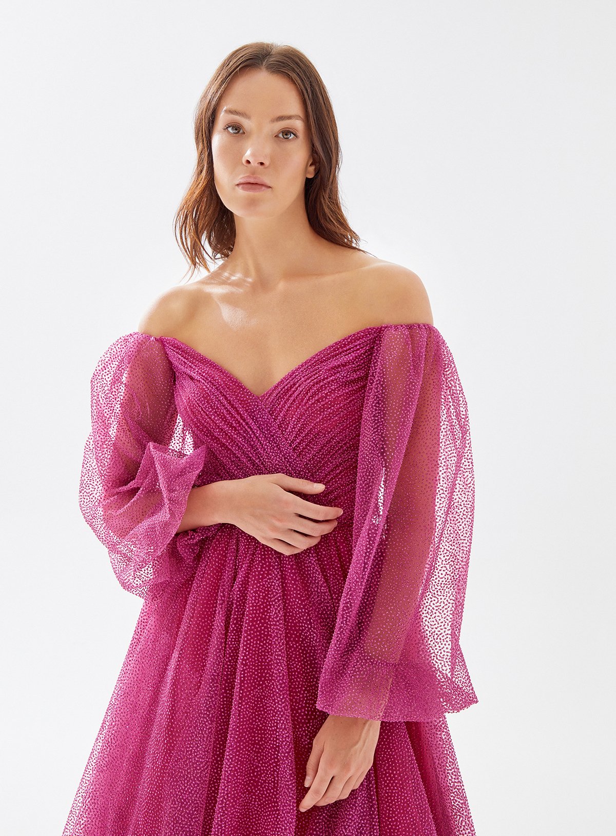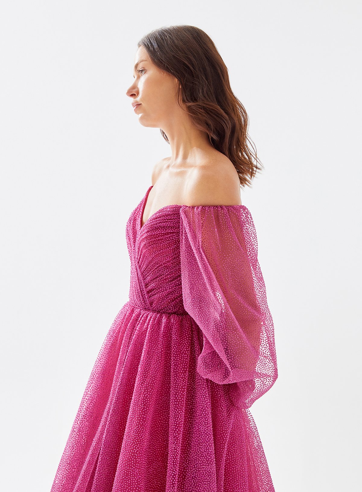 Off Shoulder Shimmer Tulle Sleeved Frill Dress