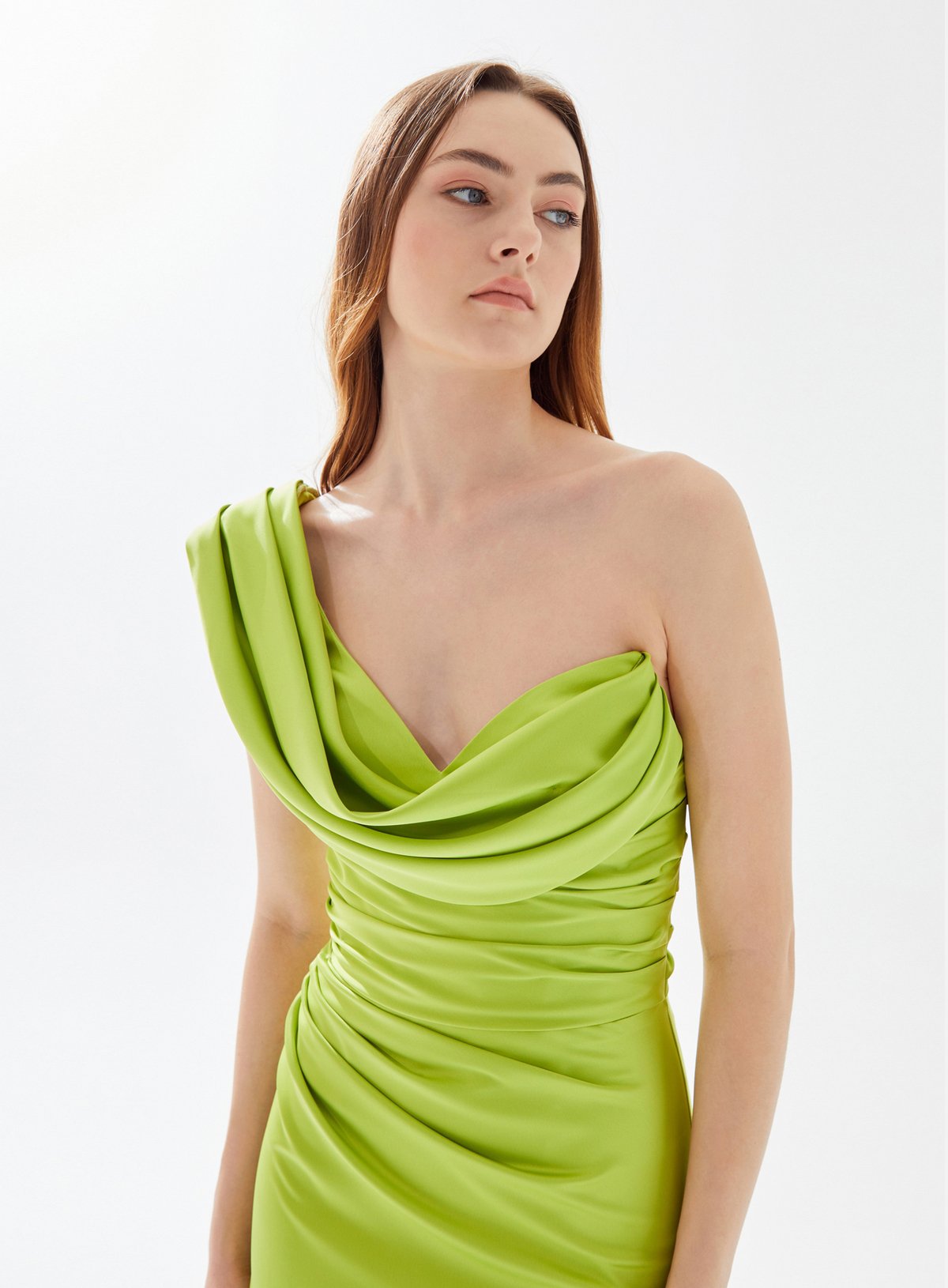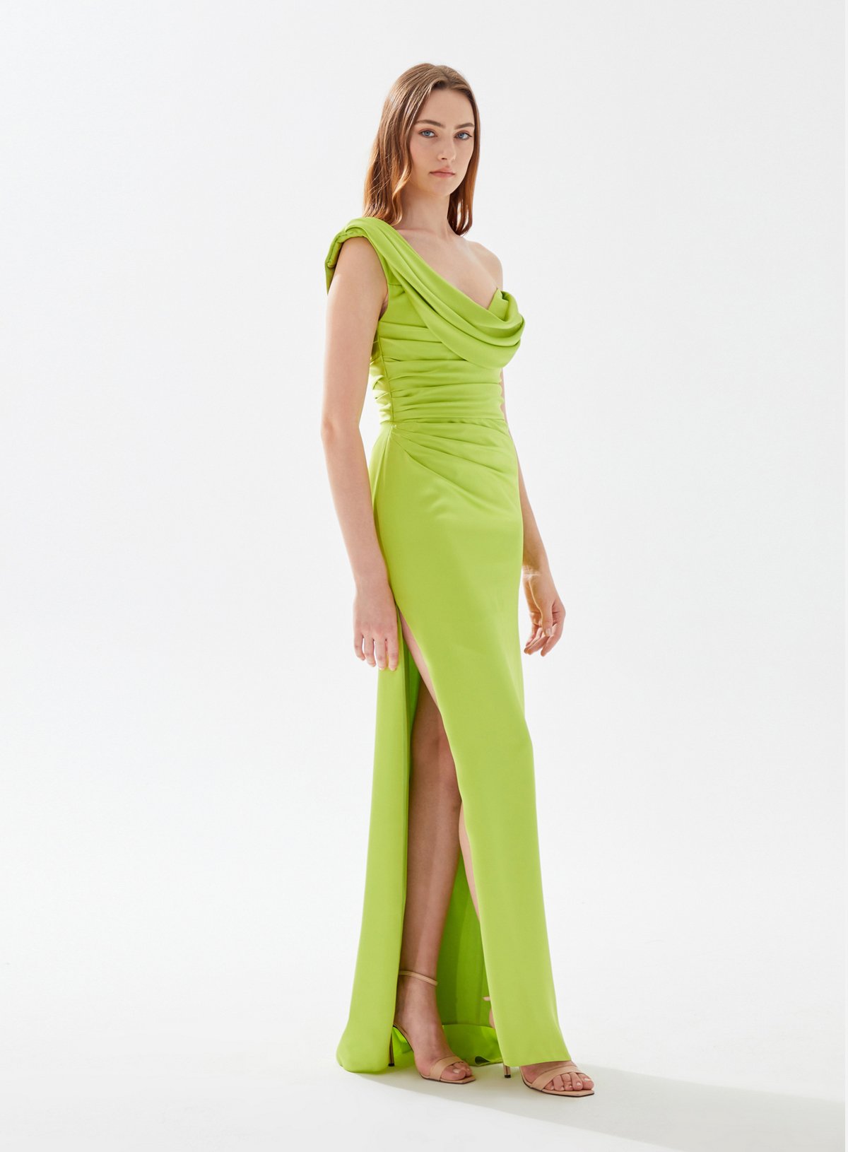 One Shouldered Draped Straight Cut Dress with Side Slit