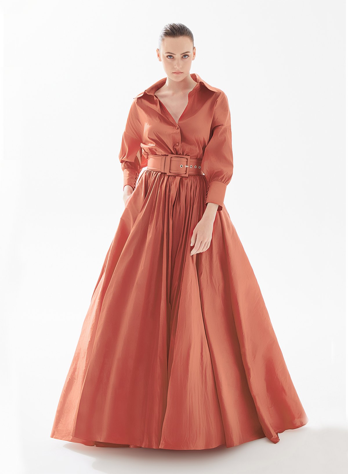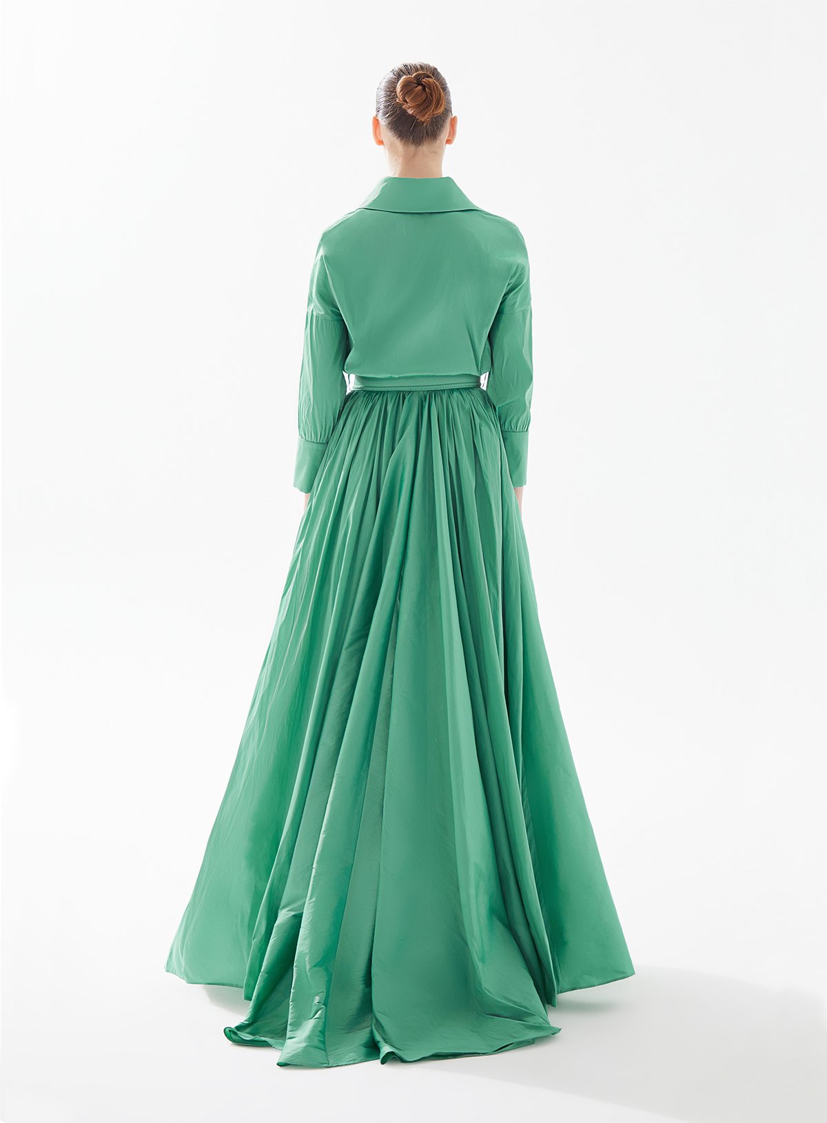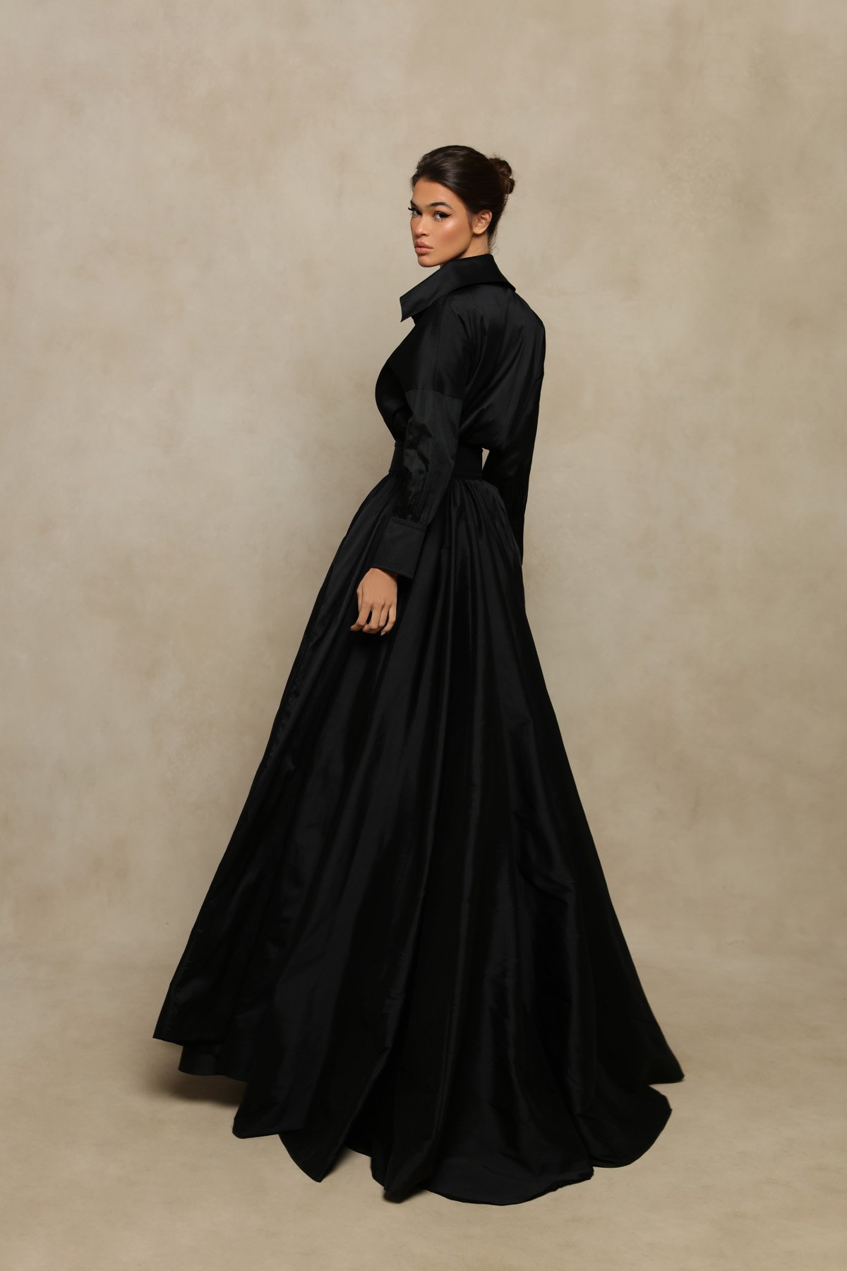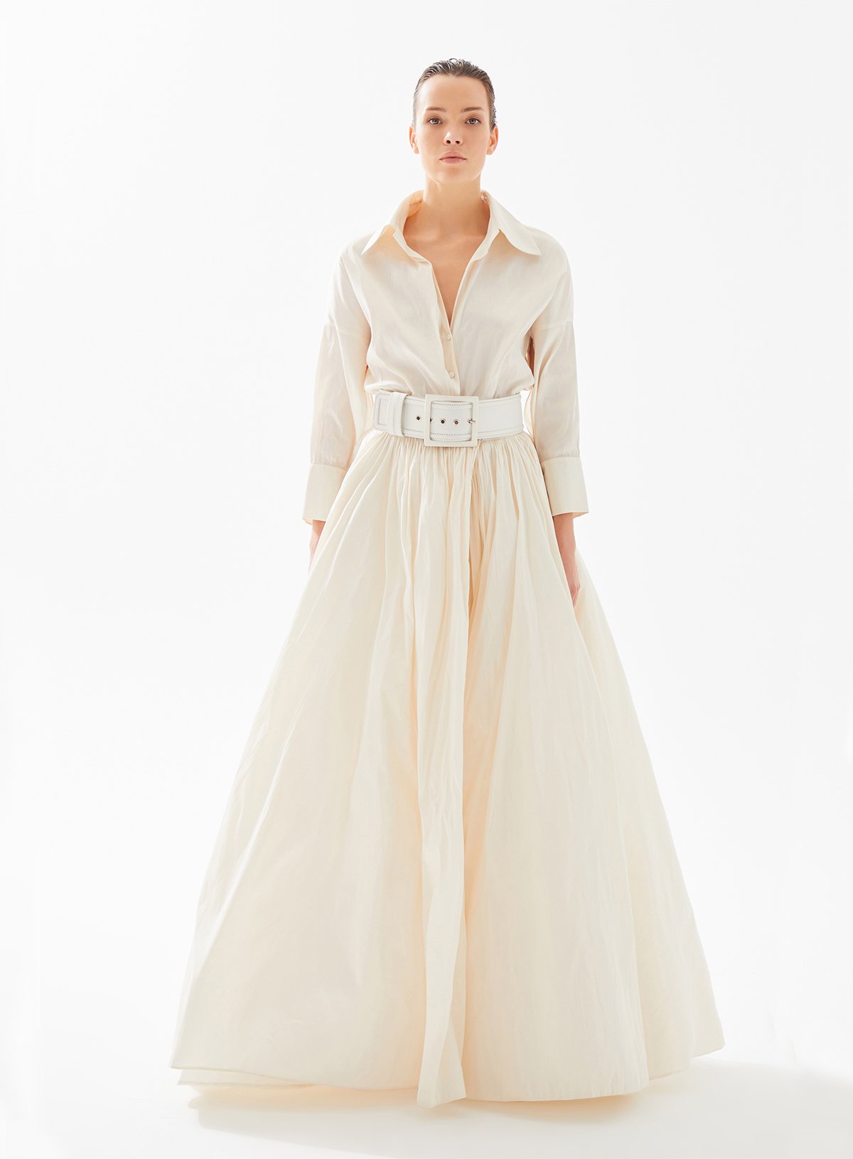 Tailored with the utmost sophistication, this is a shirtdress like no other, with a silhouette that evokes images of screen sirens of yesterday. The design features full sleeves, deep cuffs with a row of tiny buttons, and a billowing skirt that discreetly opens in the centre front.