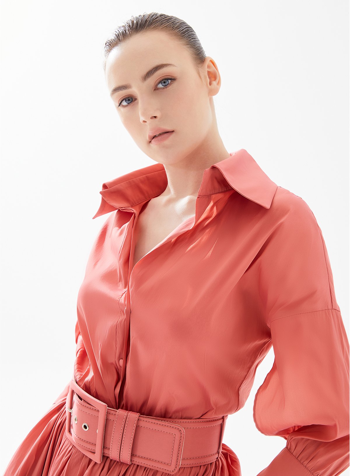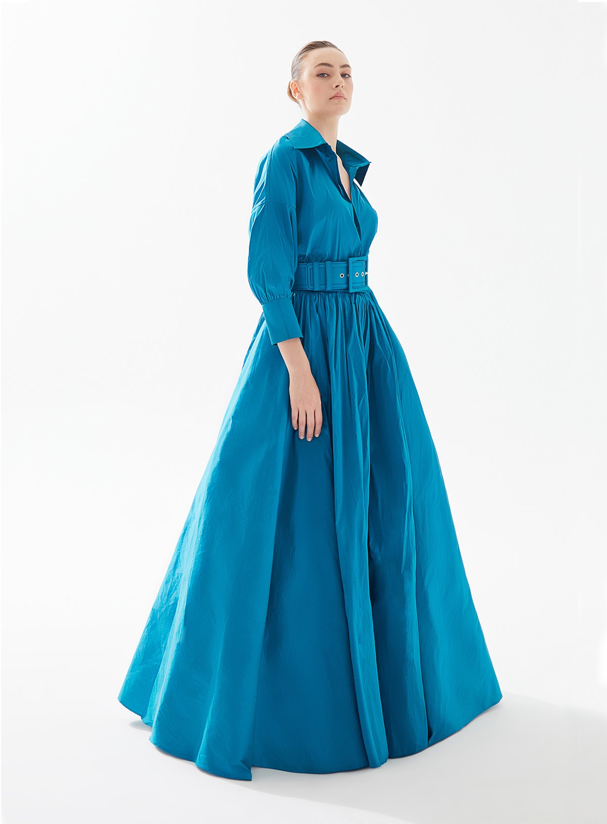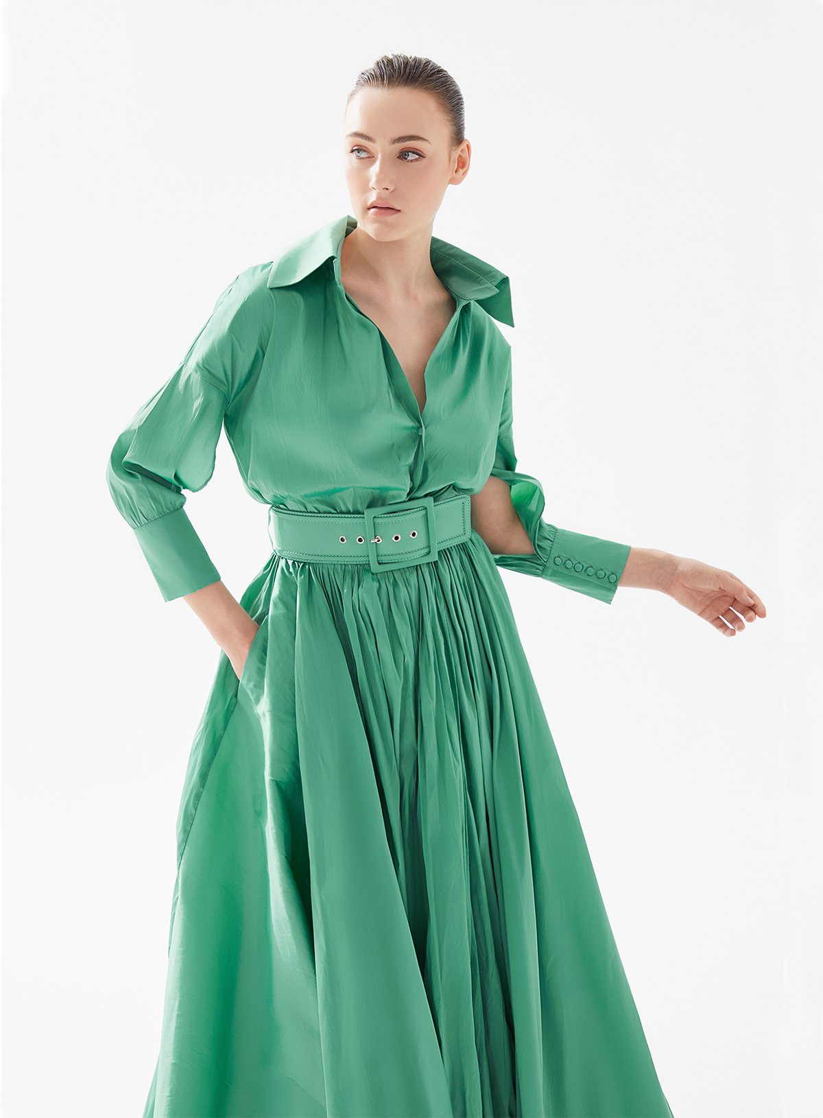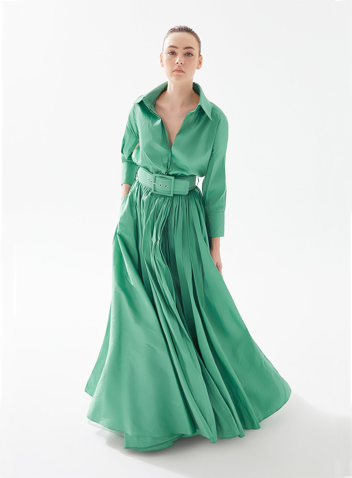 Tailored with the utmost sophistication, this is a shirtdress like no other, with a silhouette that evokes images of screen sirens of yesterday. The design features full sleeves, deep cuffs with a row of tiny buttons, and a billowing skirt that discreetly opens in the centre front.