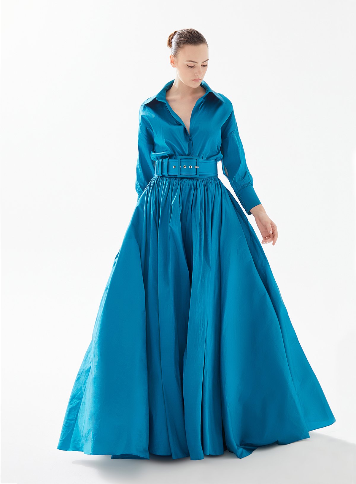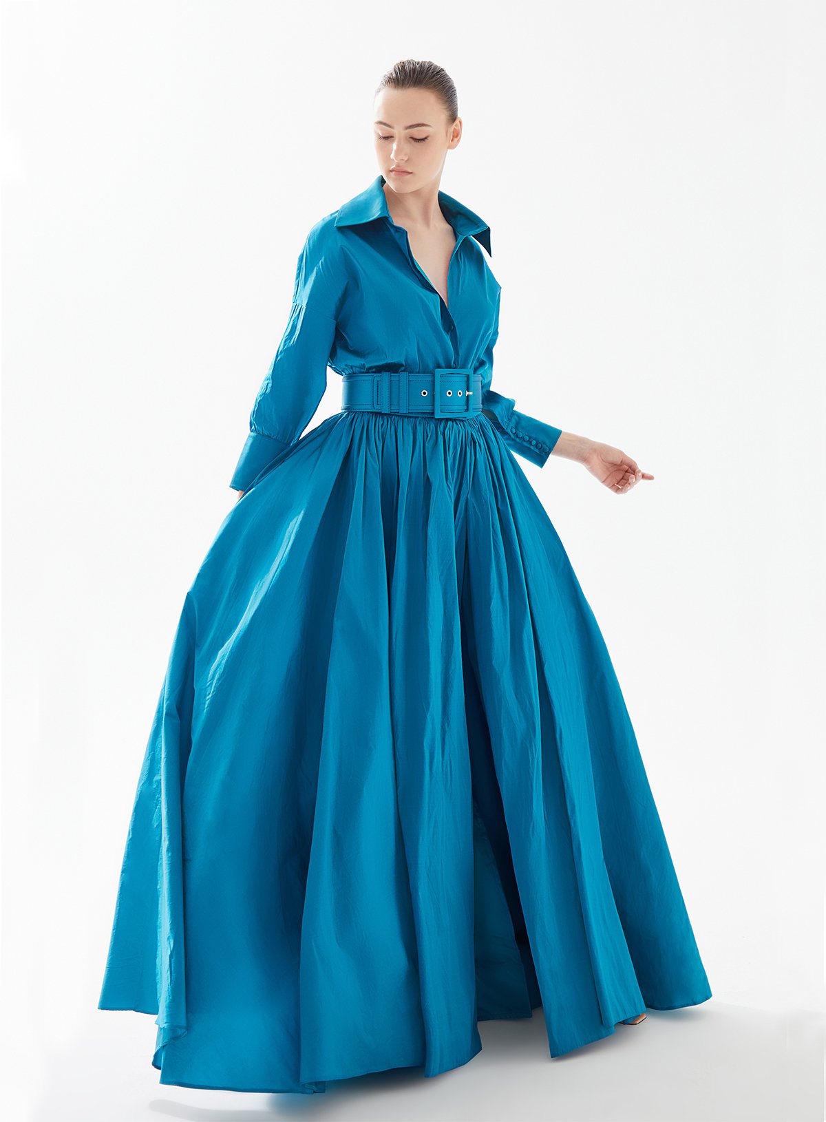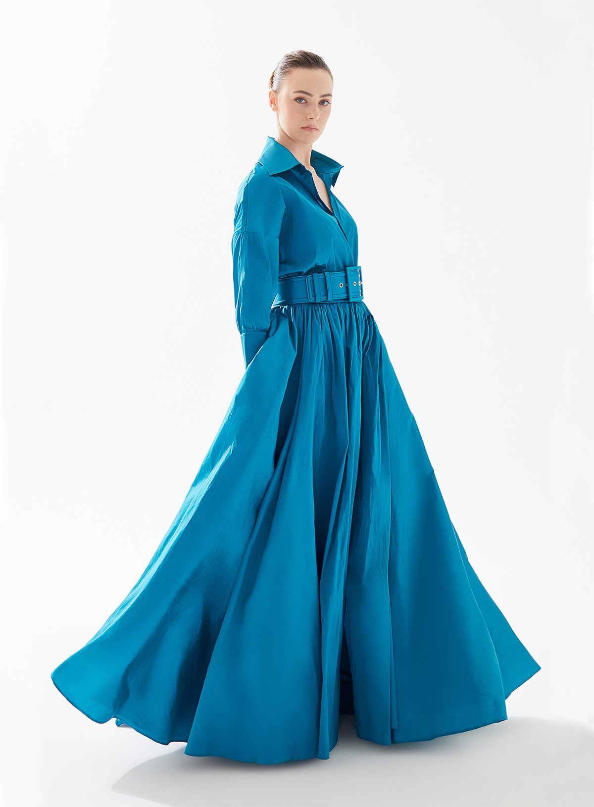 Tailored with the utmost sophistication, this is a shirtdress like no other, with a silhouette that evokes images of screen sirens of yesterday. The design features full sleeves, deep cuffs with a row of tiny buttons, and a billowing skirt that discreetly opens in the centre front.