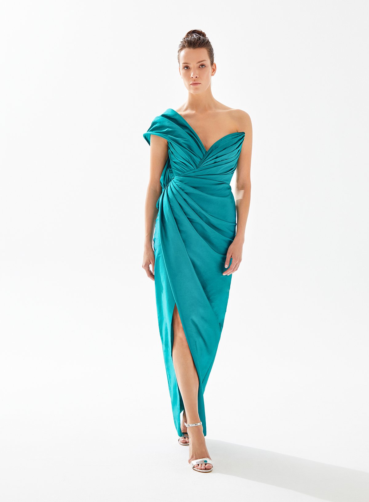 One Shouldered Draped Taffeta Dress with Back Detail