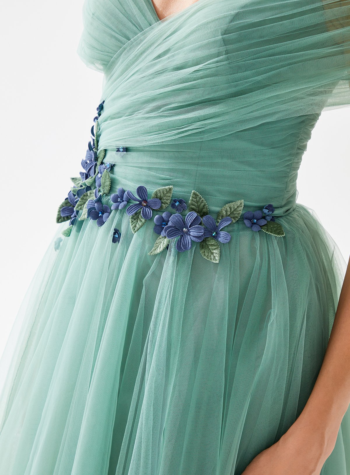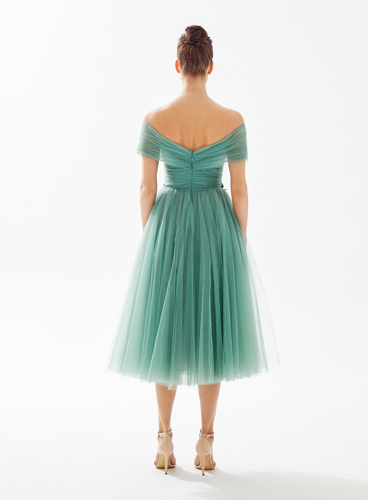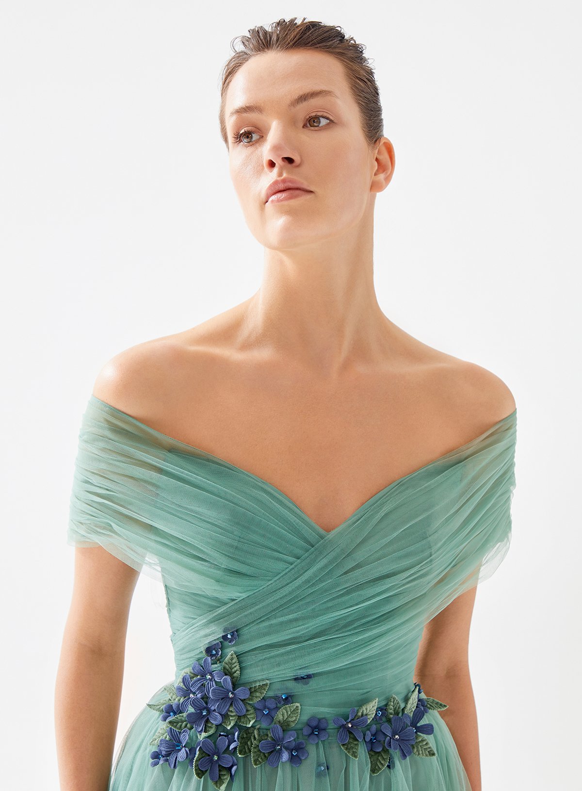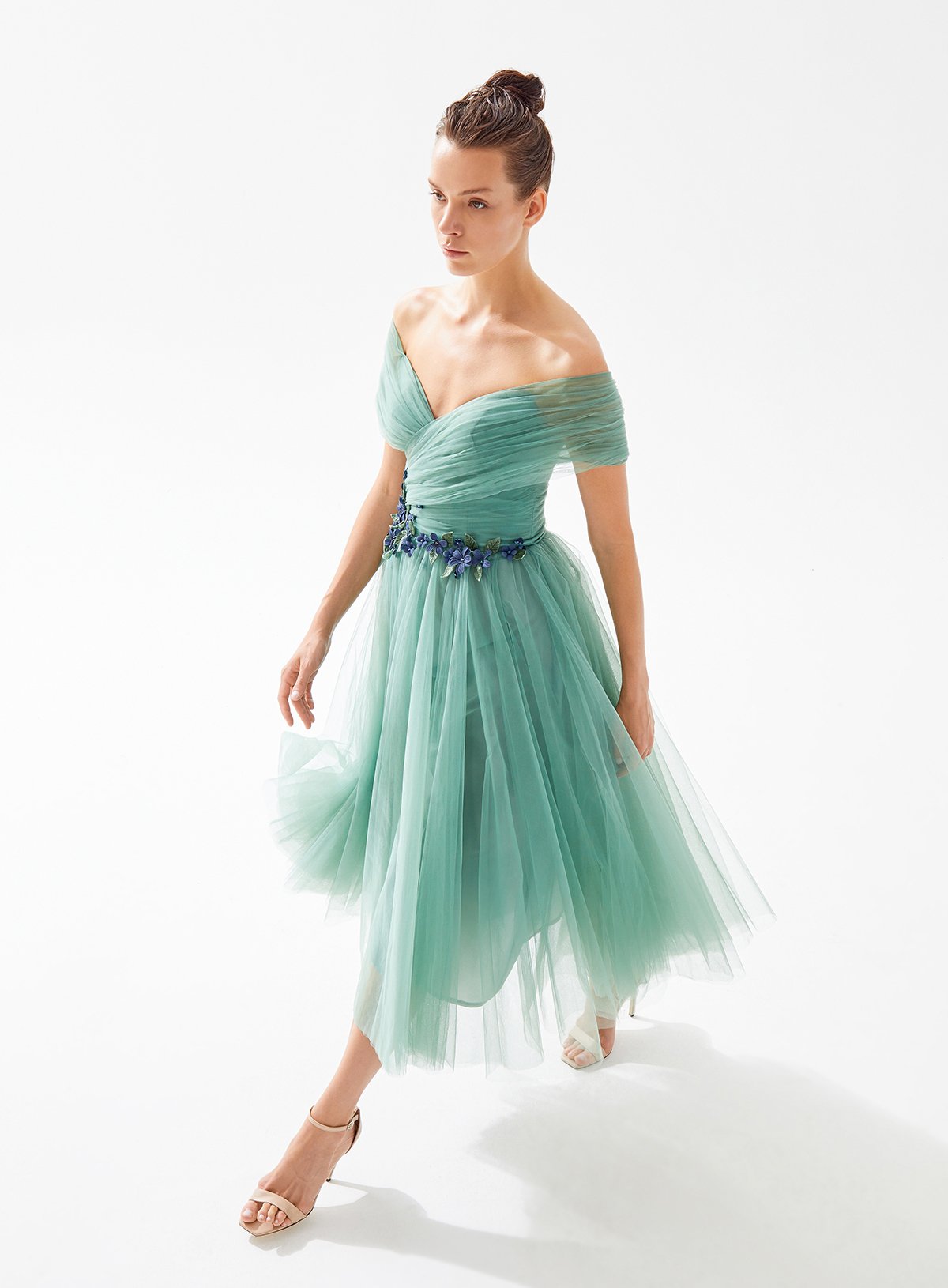 Off Shouldered Midi Tulle Dress with Flower Waits Detail