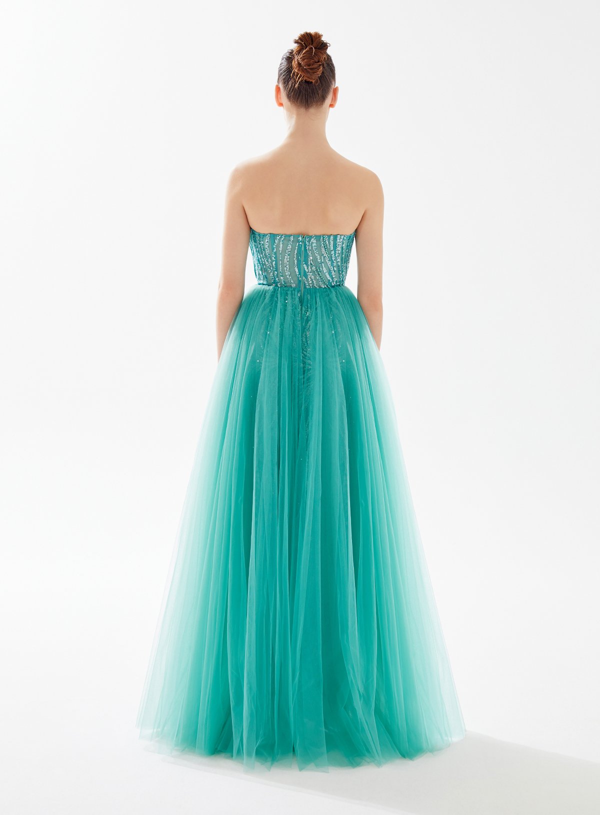 This stunning piece is embellished with sequins and beads throughout and showcases a strapless neckline and oversized bow detail. The sheath skirt has a thigh-high slit and an overlay A-line skirt for added drama.