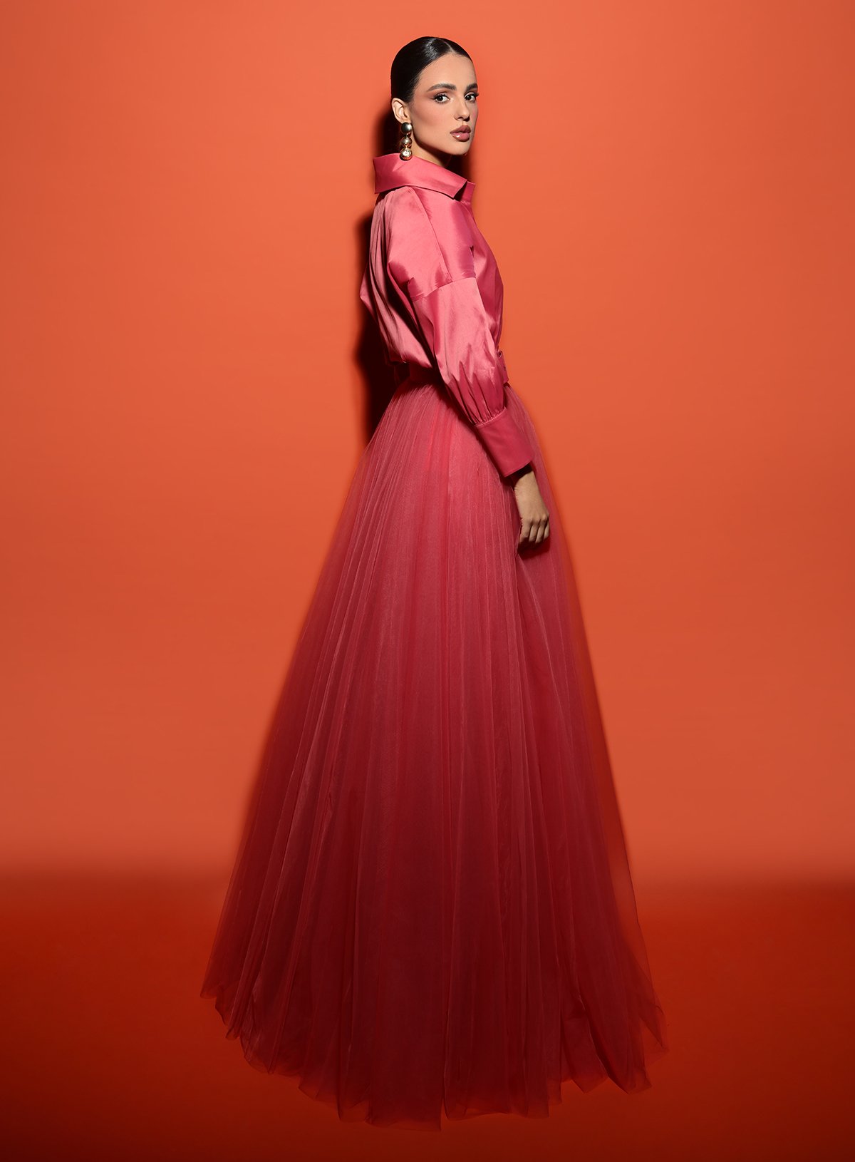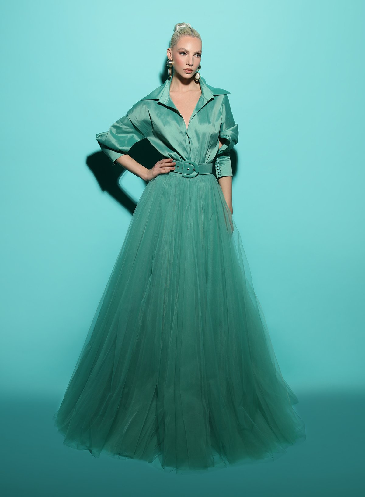 This gown boasts a timeless beauty with its collared deep v-neckline, full back, and long sleeves with buttons cuff. The buckled belt emphasizes your waist for a sleeker look. The ruched skirt gracefully glides into an A-line silhouette with an enthralling sweep train finish.