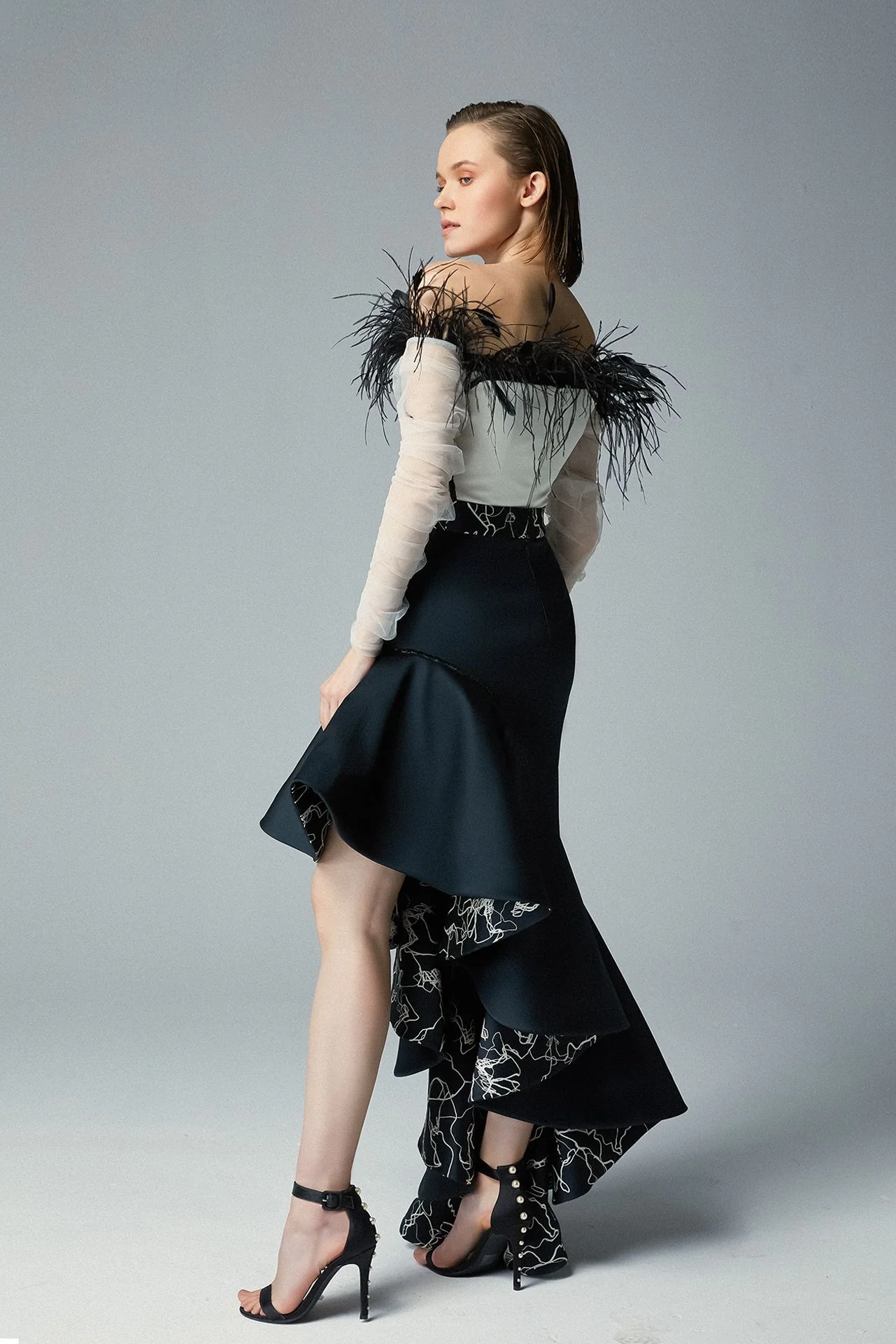 Off-shoulder corset top with black feather ornaments on the trims of the neckline and the backline with off-white draped sheer sleeves. A black jacquard column skirt with a high side cascading in a doublure of a seamless abstract pattern matching with a waist belt.