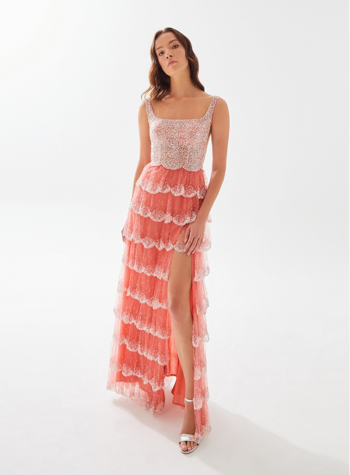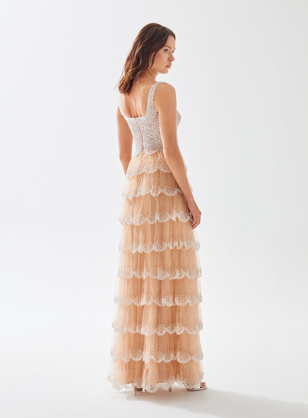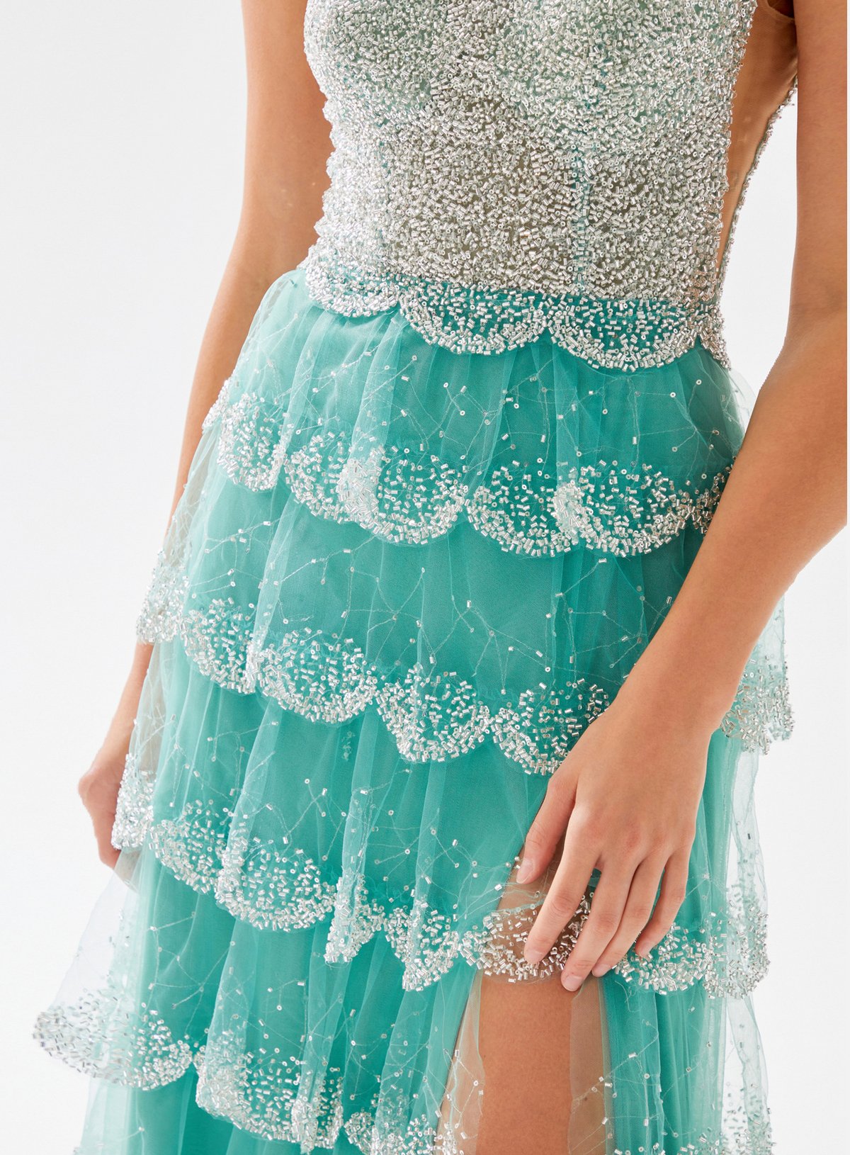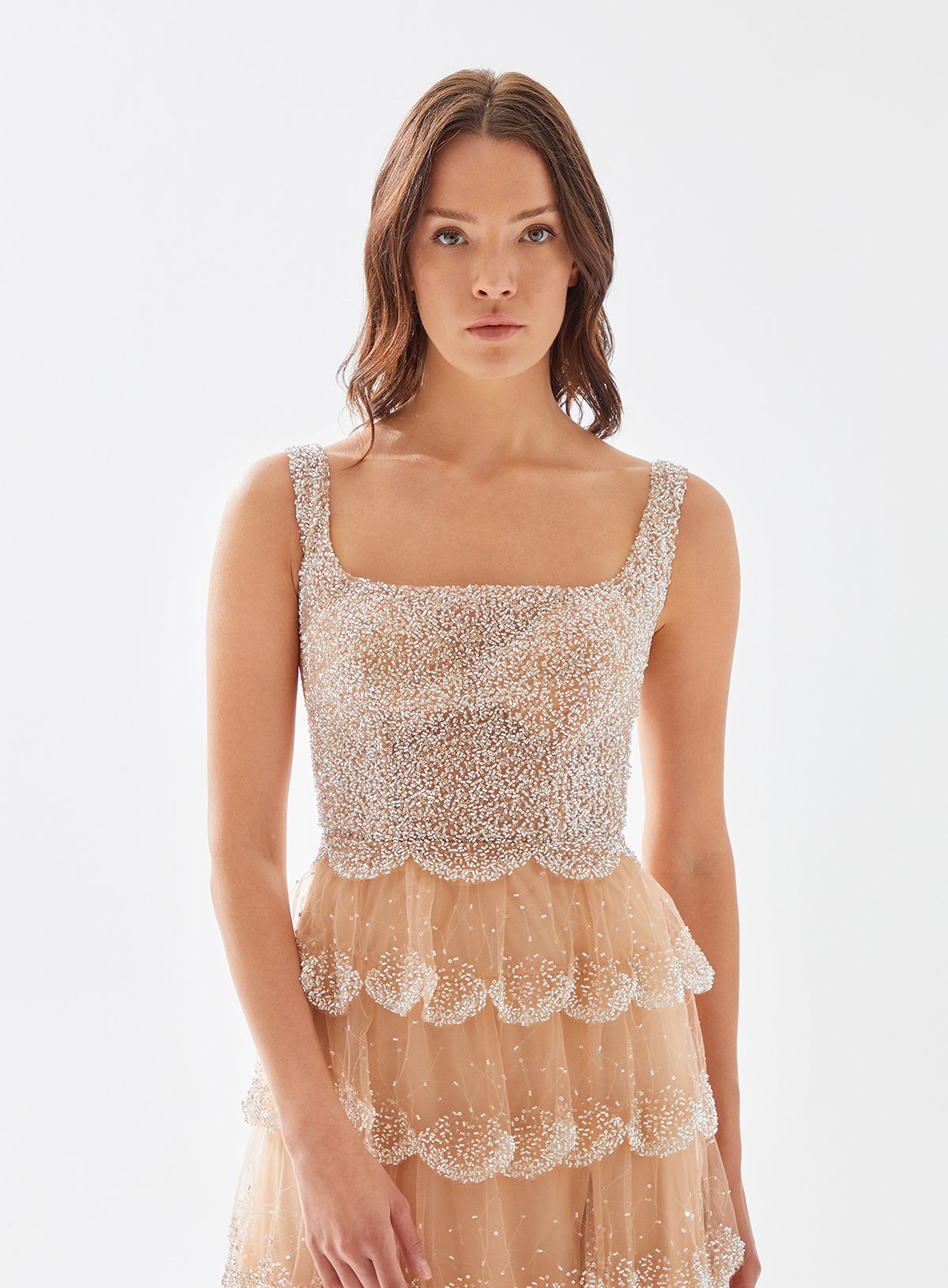 Square Neck Beaded Dress with Layered Ruffle