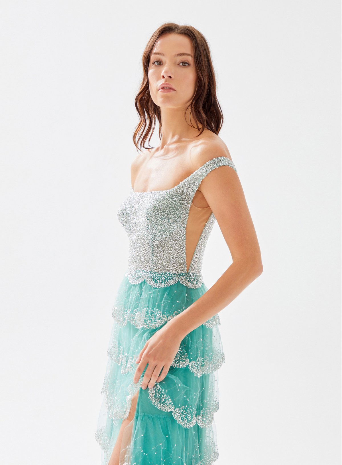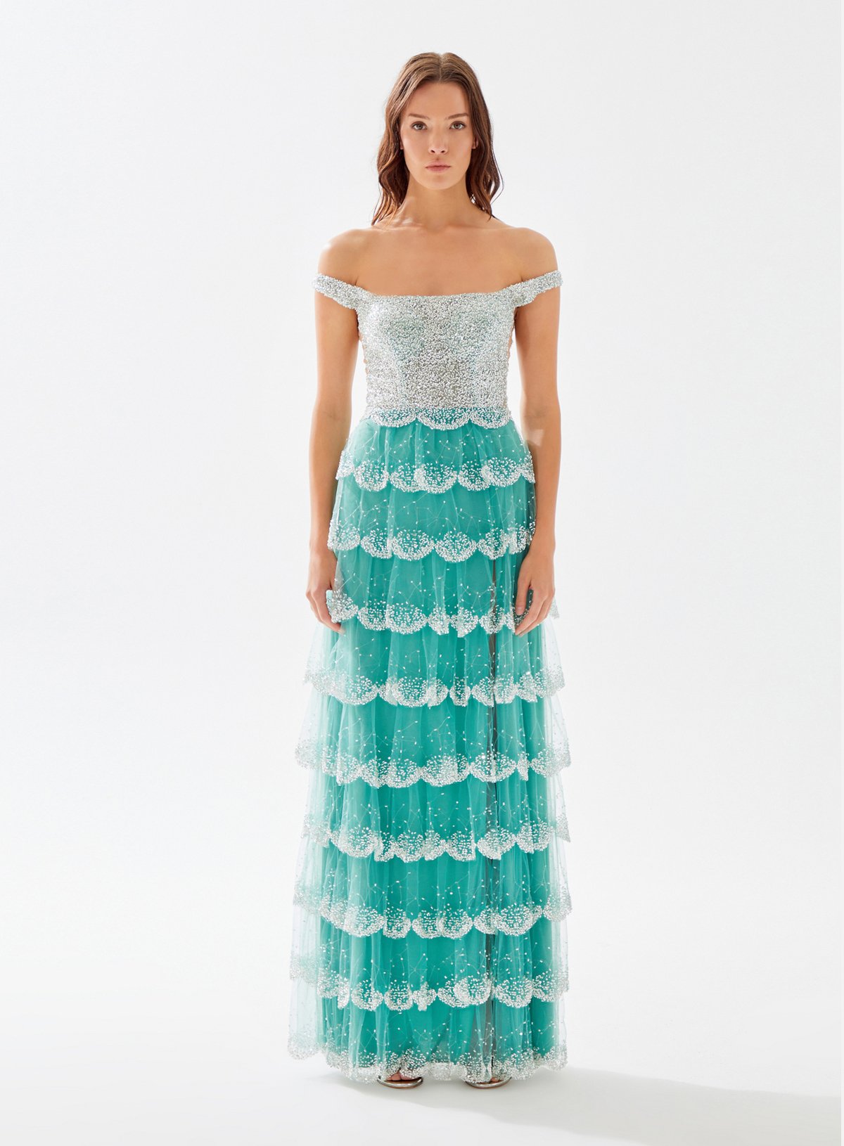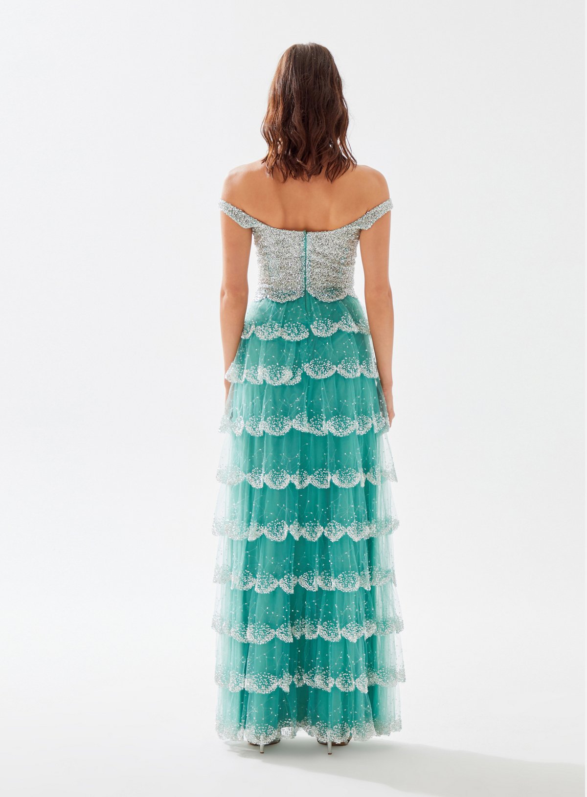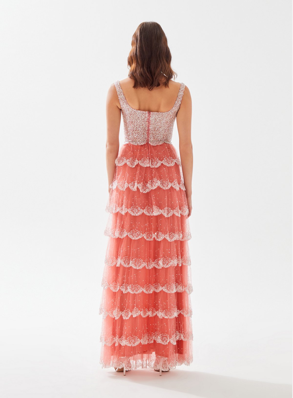 Square Neck Beaded Dress with Layered Ruffle
