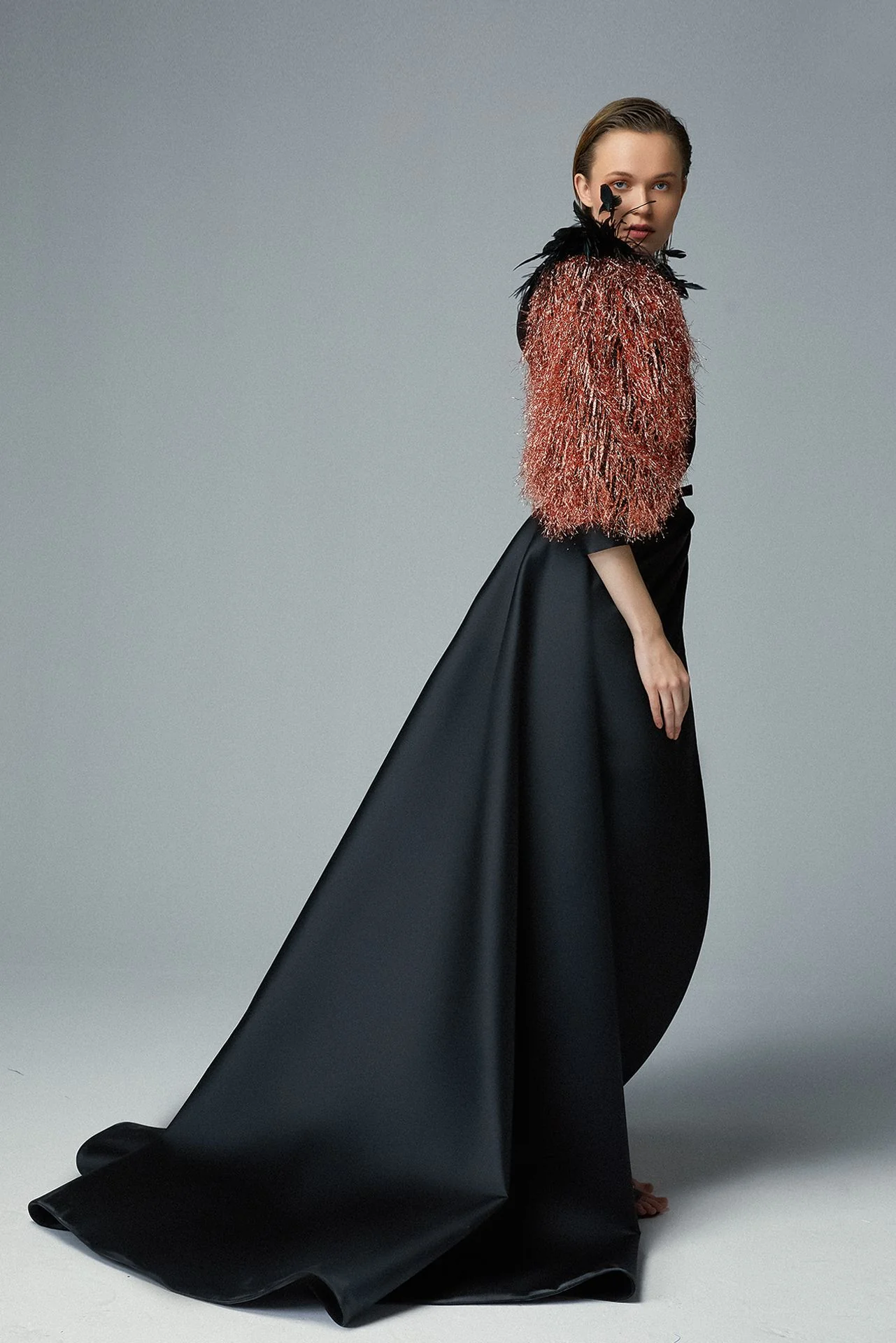A hand-made feather ornament over one shoulder black Cady evening dress with an asymmetric slit on the top revealing a classy allurement. This evening dress tighten on the waist with a fitting Cady belt before rousing lively to the floor in a high-thigh slit in a sweep length. The uniqueness of this dress is its one puff copper organza lurex sleeve with its fluffy looking but yet very magically futuristic!!!