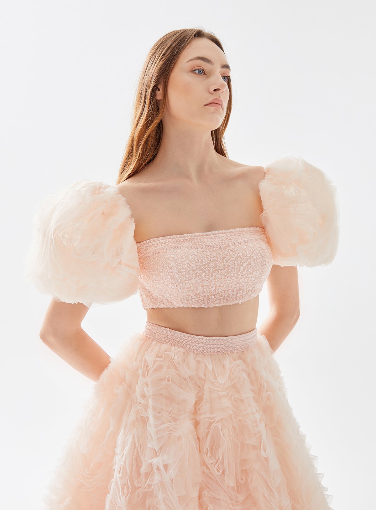 Puff Sleeved Beaded Crop Top and Tulle Skirt