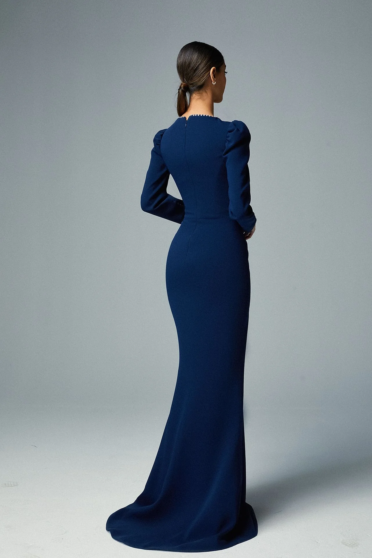 Navy Blue Crepe Evening Dress of Swarovski Fine Eclat Decoration