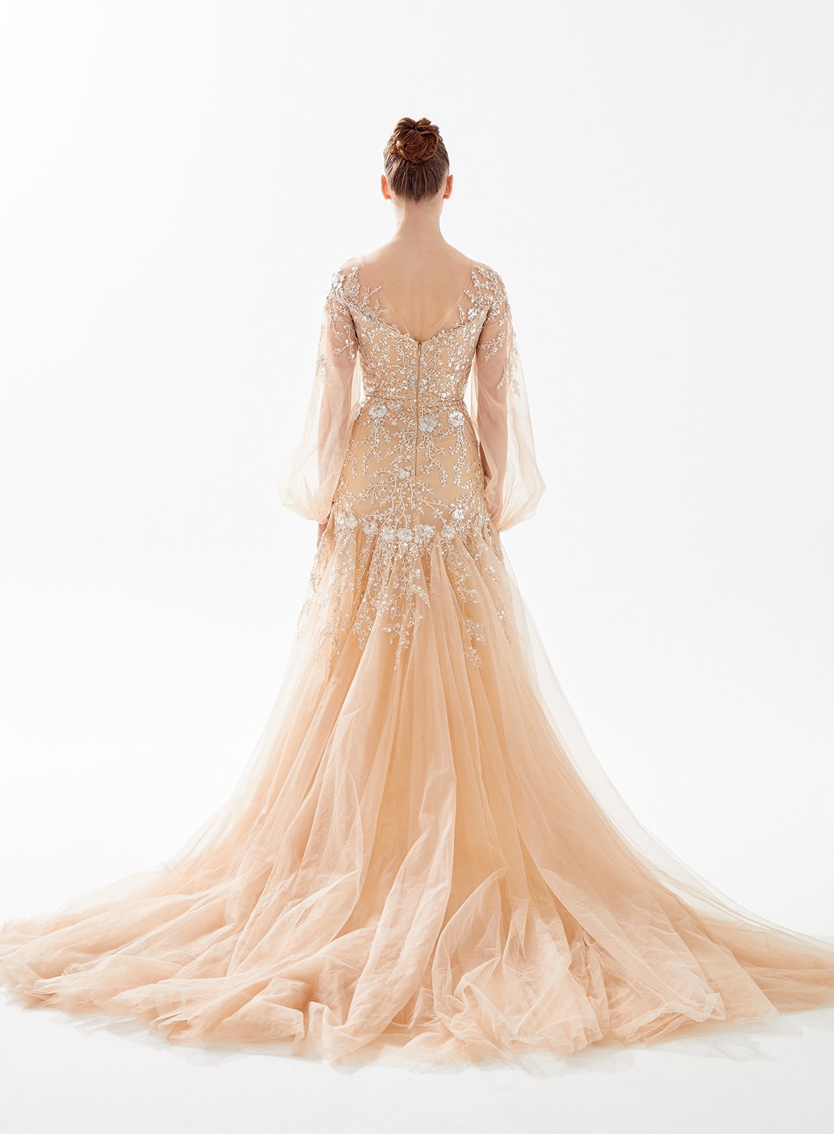 Long Sleeved Sheer Neck Embellished Tulle Dress