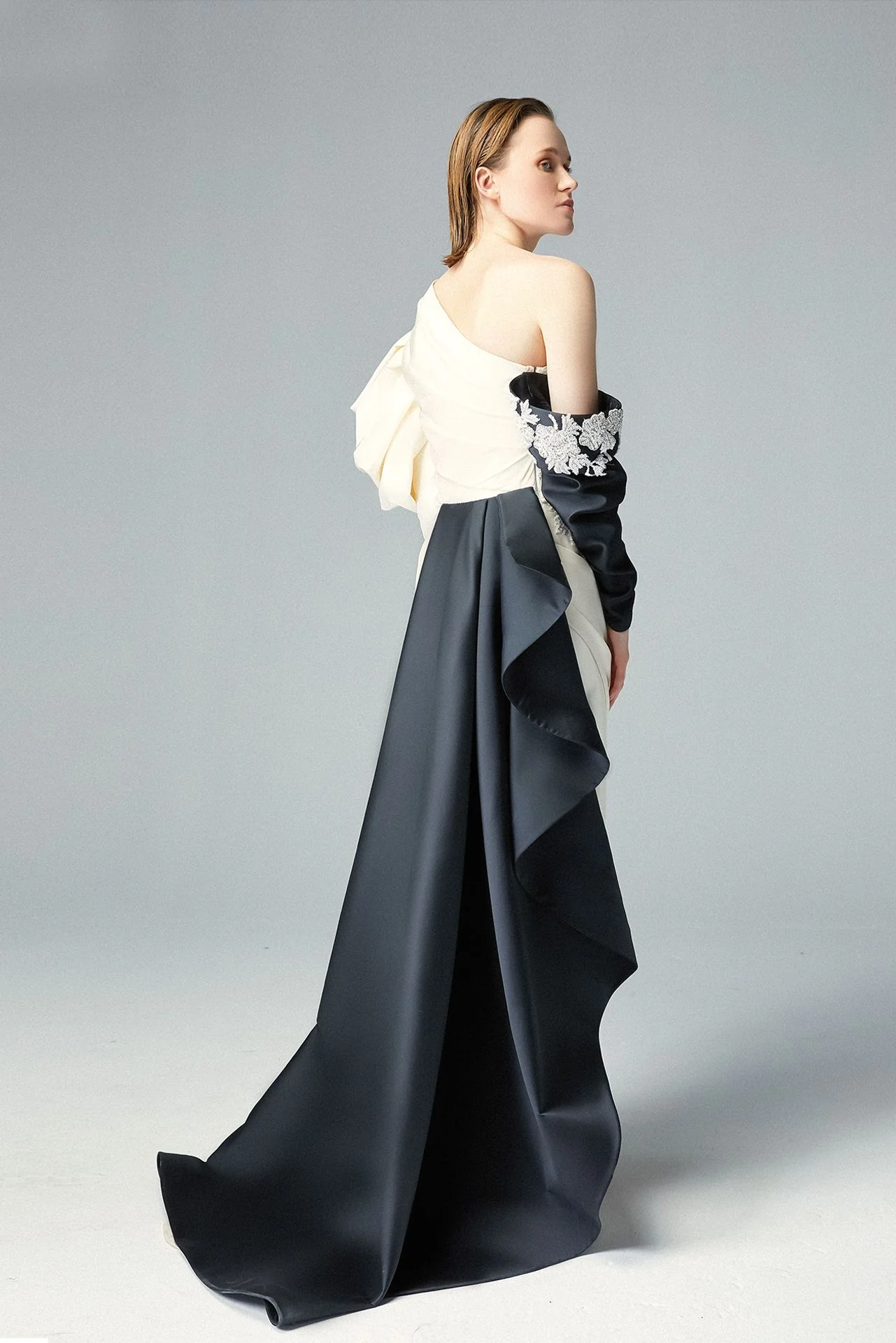 Black detached sleeve hand-made embroidered with Swarovski floral pattern crystals attached to a white Cady core embroidered with the same Swarovski floral pattern on the side. An amazing antagonist! Another puffy high shoulder over a long off-white sleeve, asymmetrically draped off-white dress rolling to the floor with a high-thigh slit and a black over-skirt on the backside cascading in a sorceress style! An angelic touch with sophistication at heart!!
