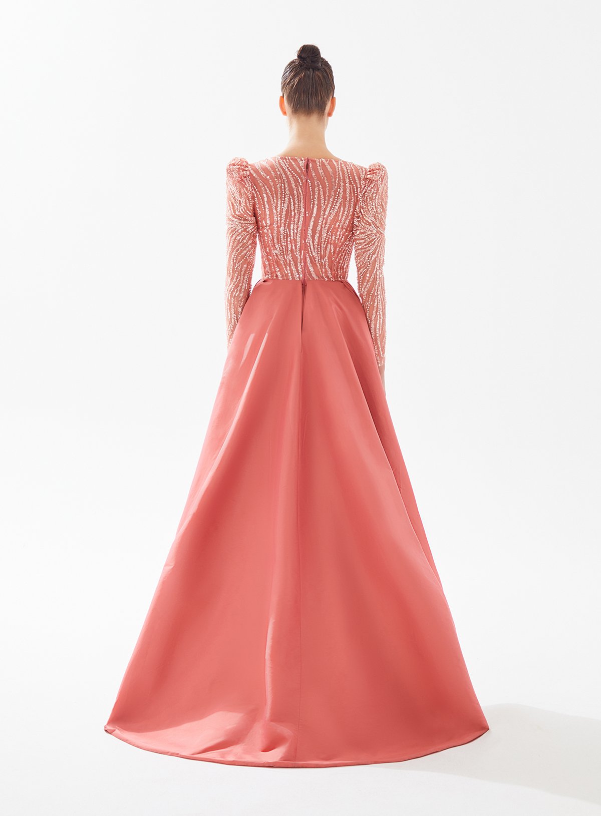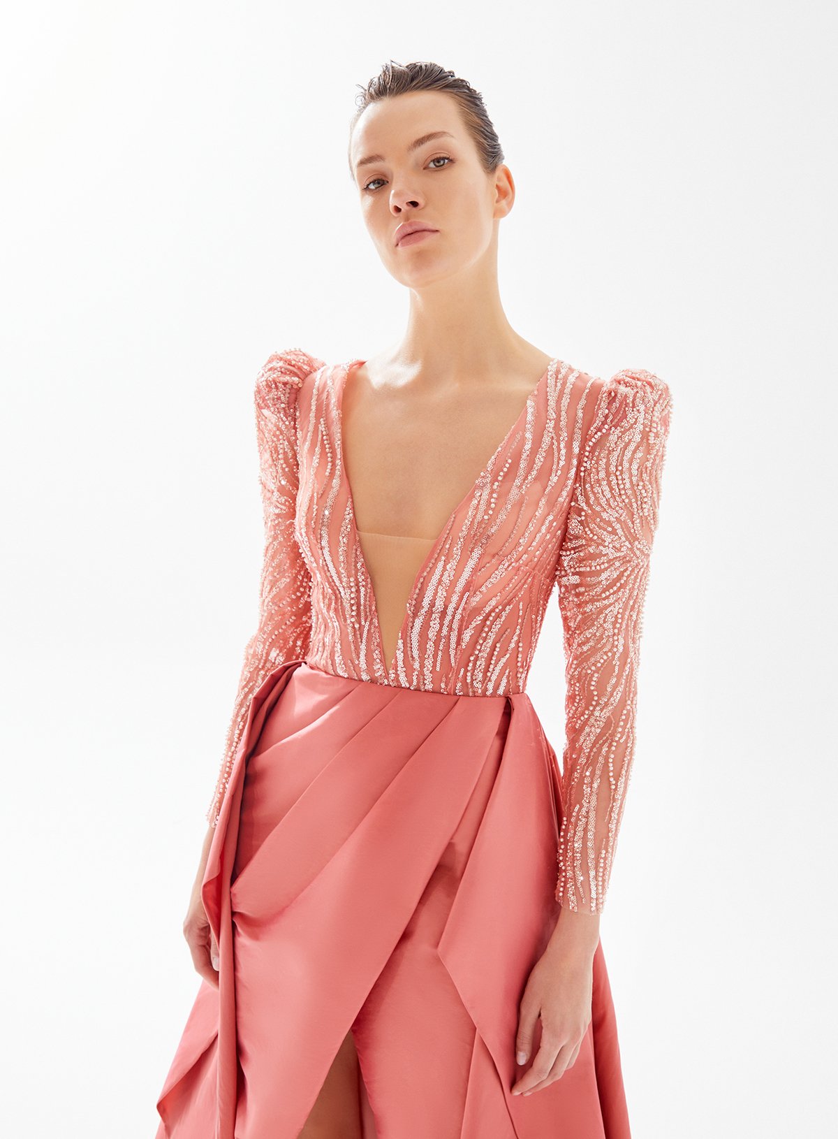Padded Shouldered Embellished V Neck Dress with Layered Taffeta Skirt