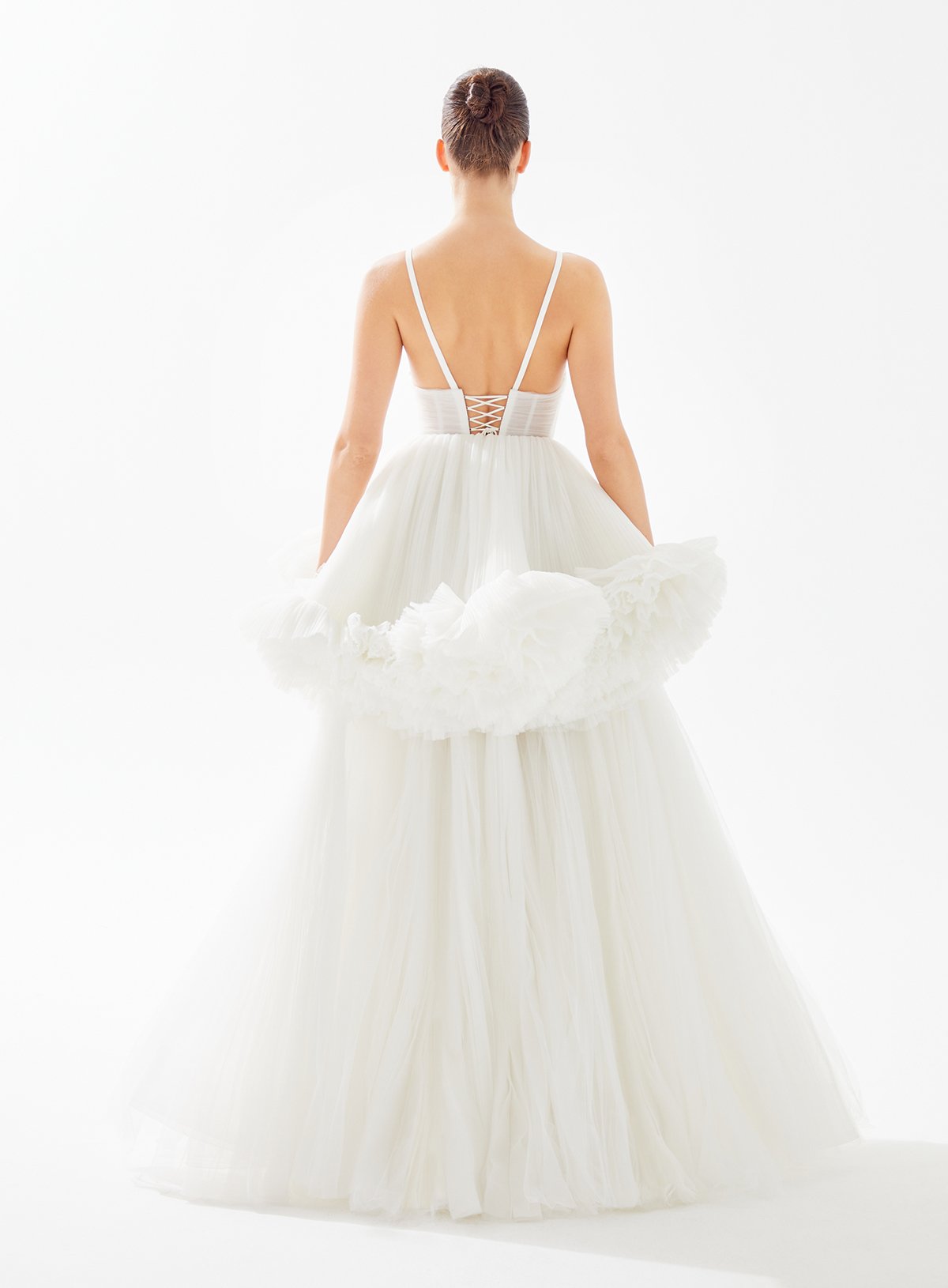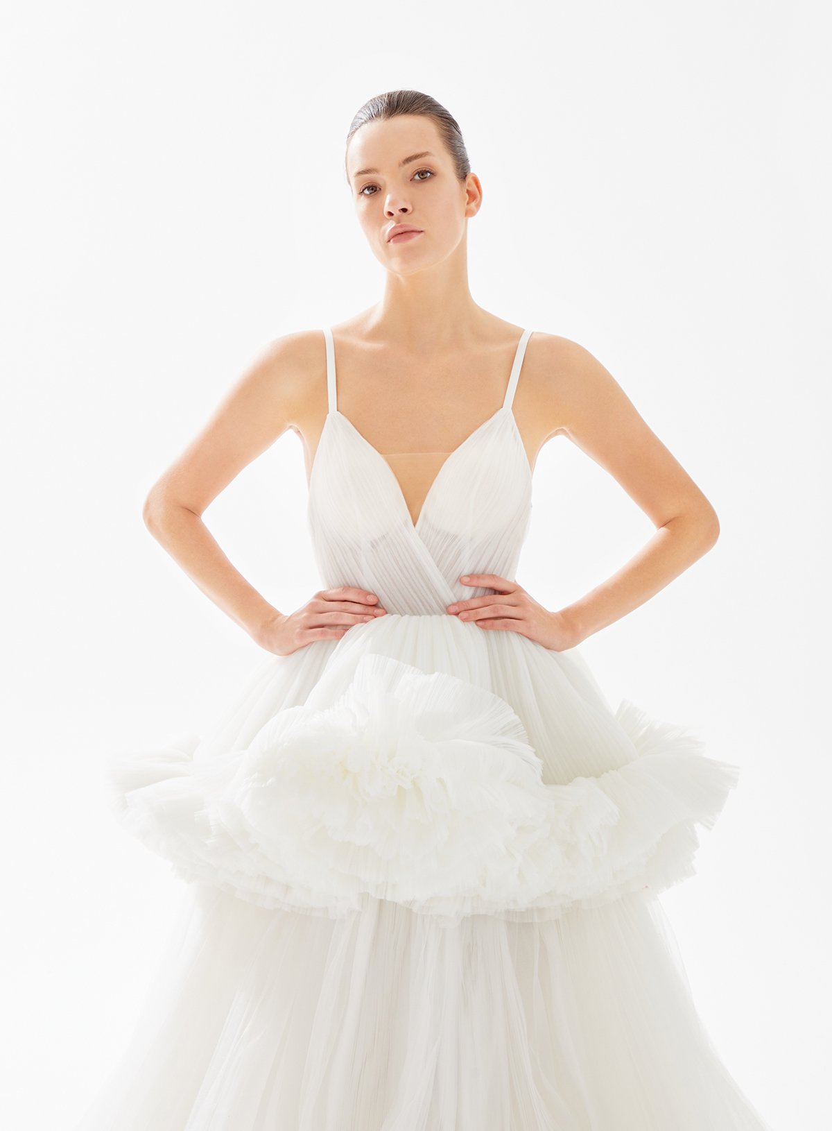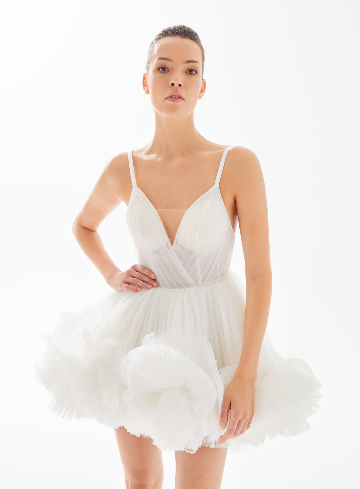 Triangle Neck Tulle Dress with Ruffle Accent