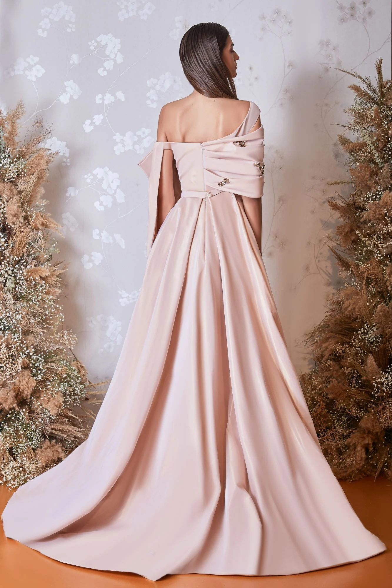 One wide shoulder, beaded bow bodice with A-line slit skirt with some pleats.