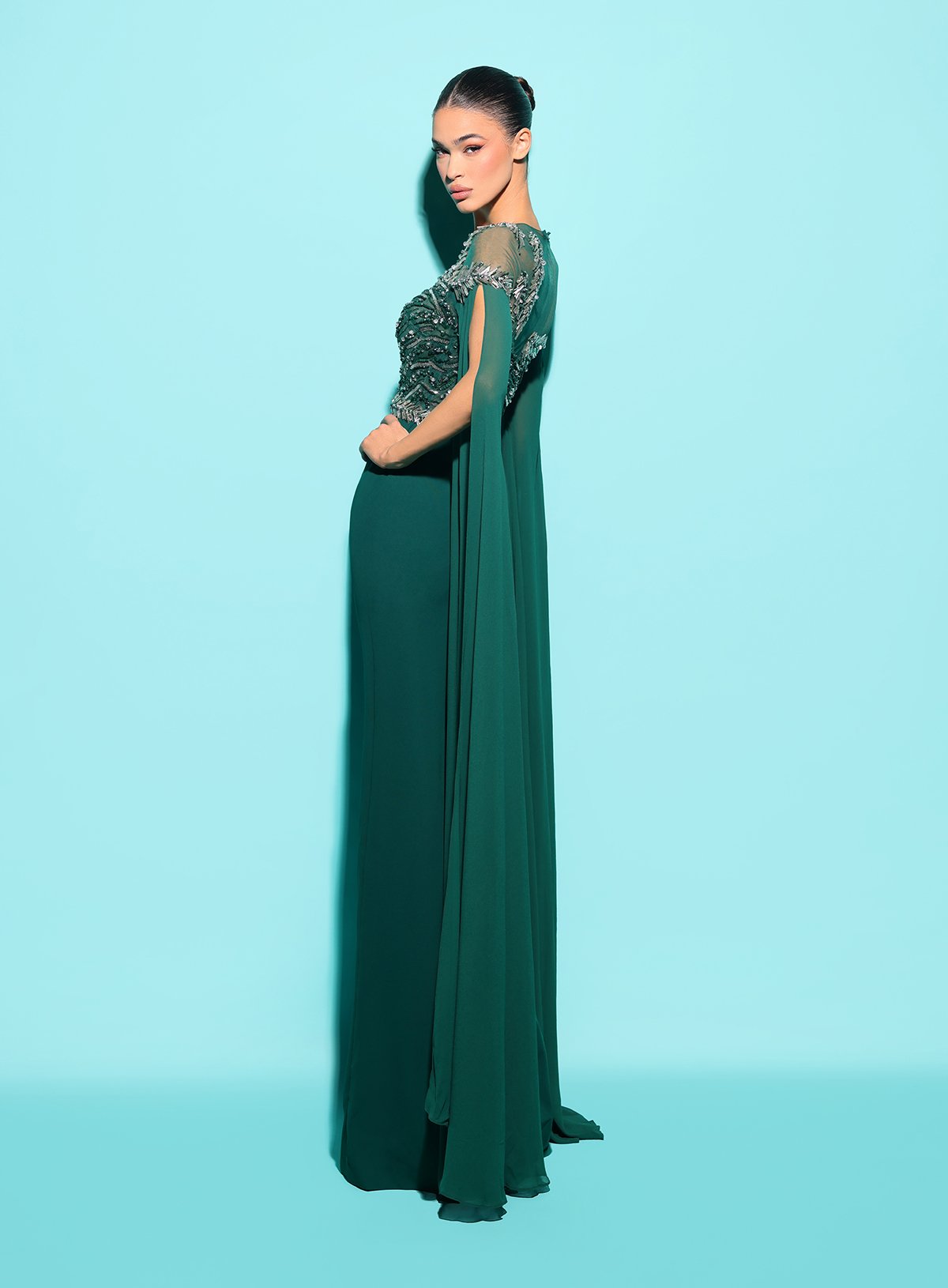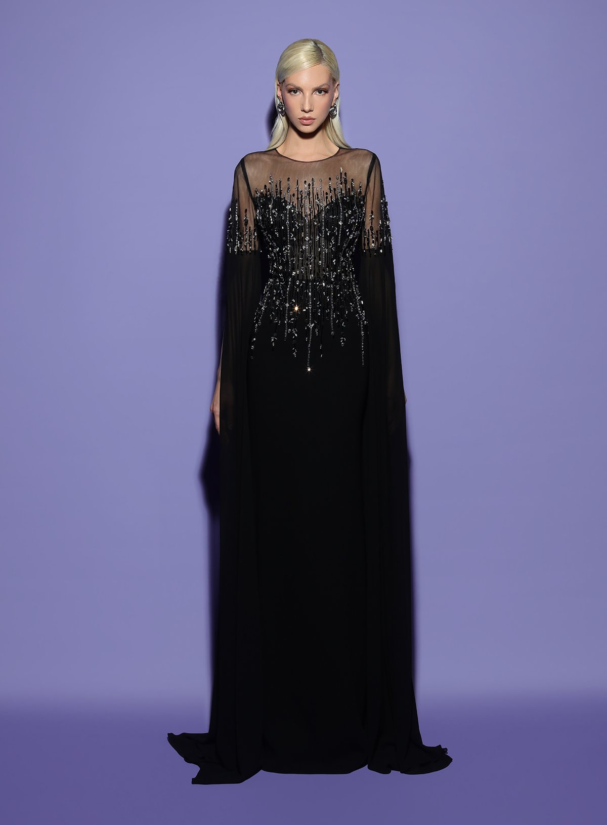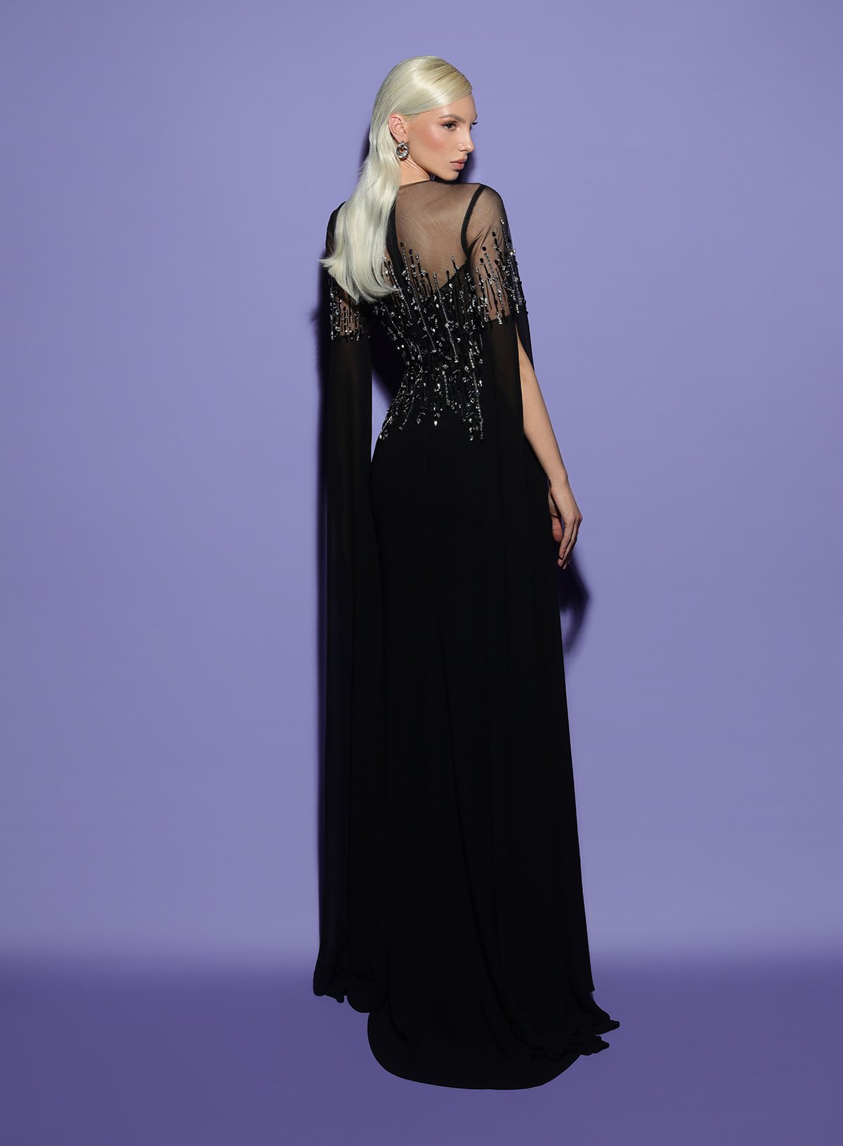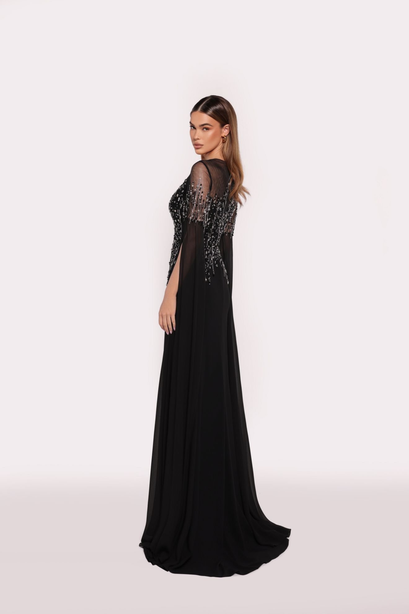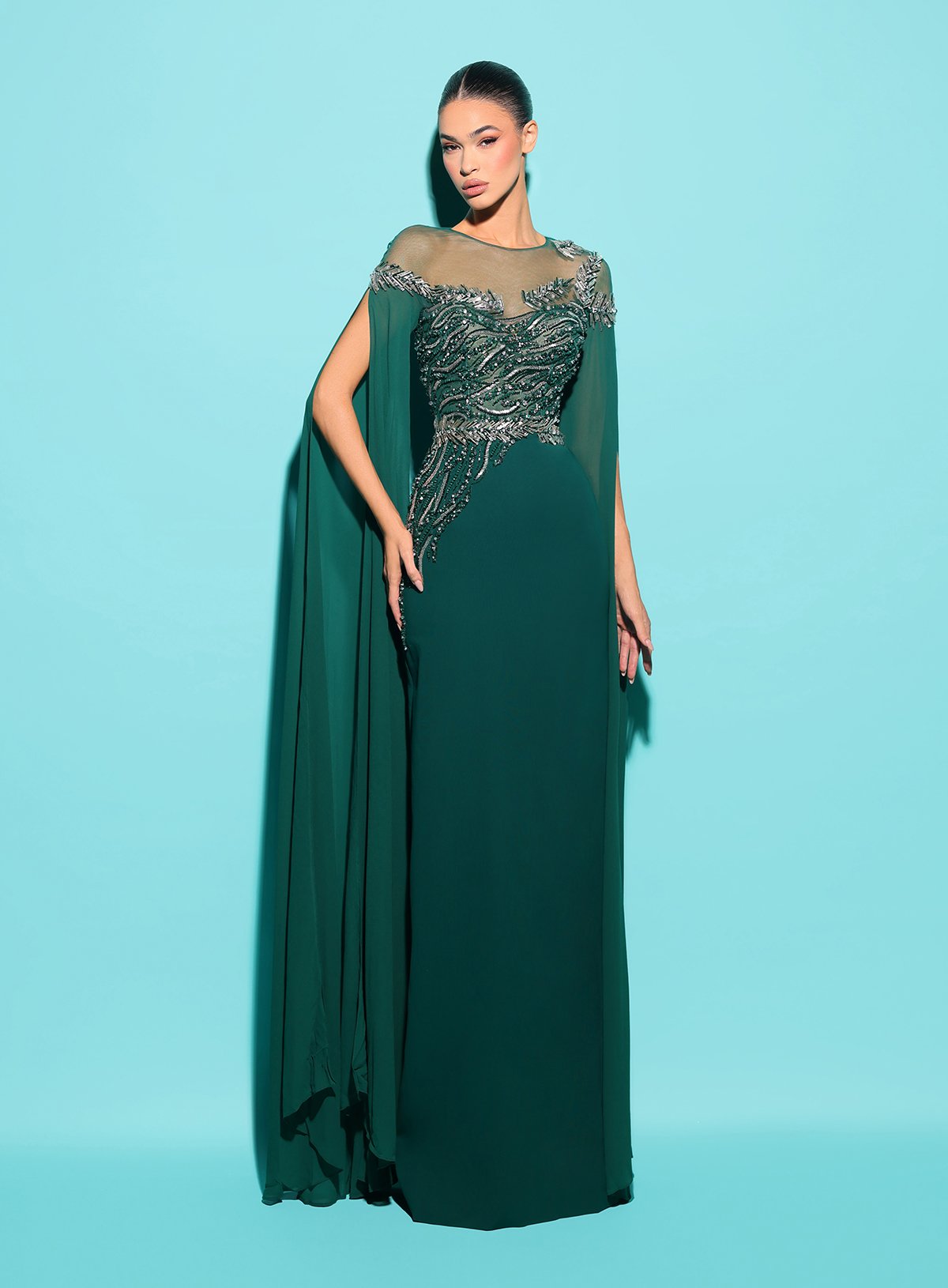 Adorned with delicate crystal beading, this gown is a true showstopper at any special event. The illusion bodice flourishes a jewel neckline with sweetheart lining, and partial illusion full back. The long cape sleeves provide a dramatic touch and make you feel like royalty. To finish it off, the skirt crafts an A-line silhouette that streams to the floor and lengthens into a sweeping train.