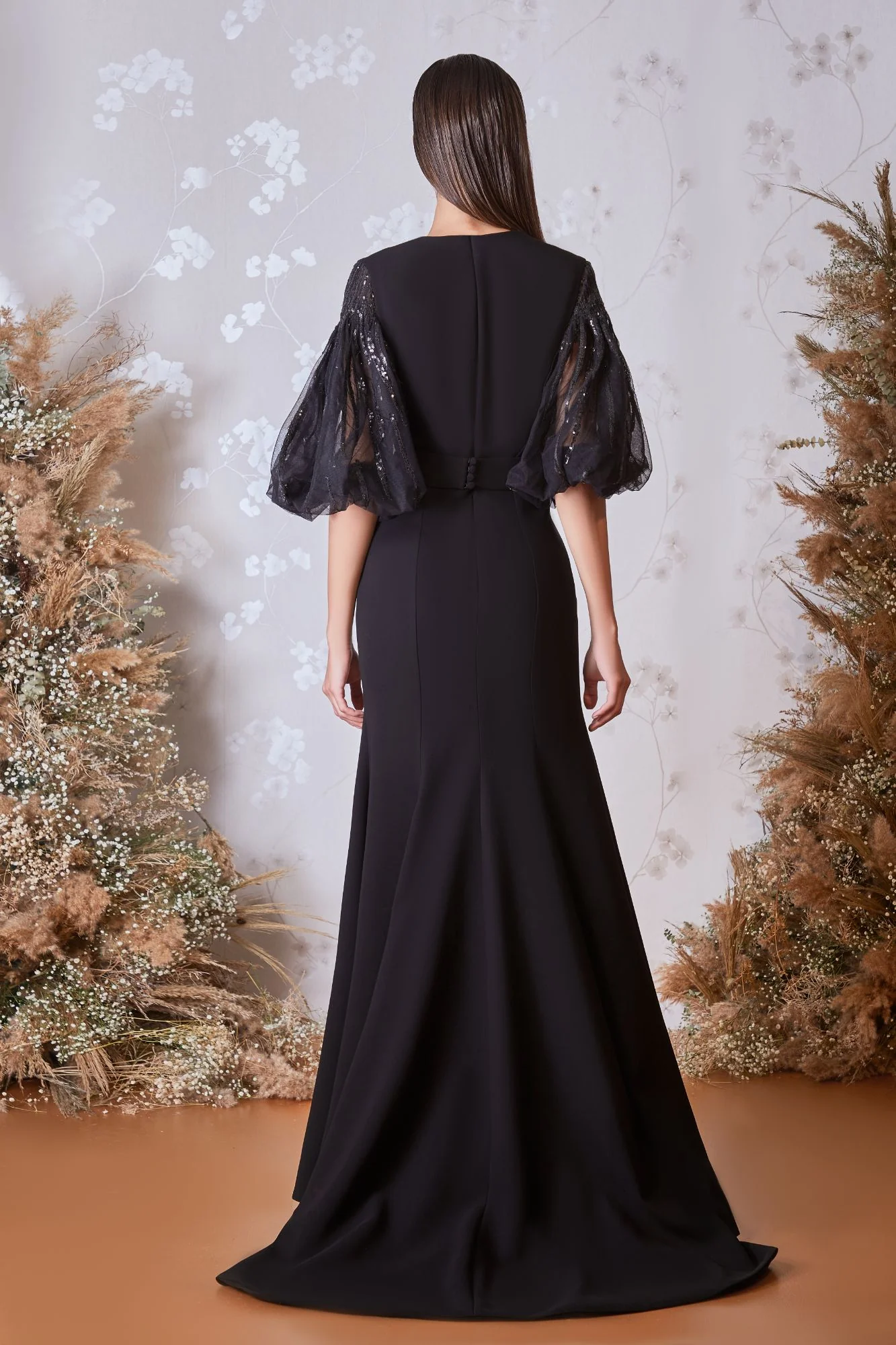 Plunging buttoned neck with sequined sheer short banded sleeves, waist belt and A-line flare front buttoned skirt.