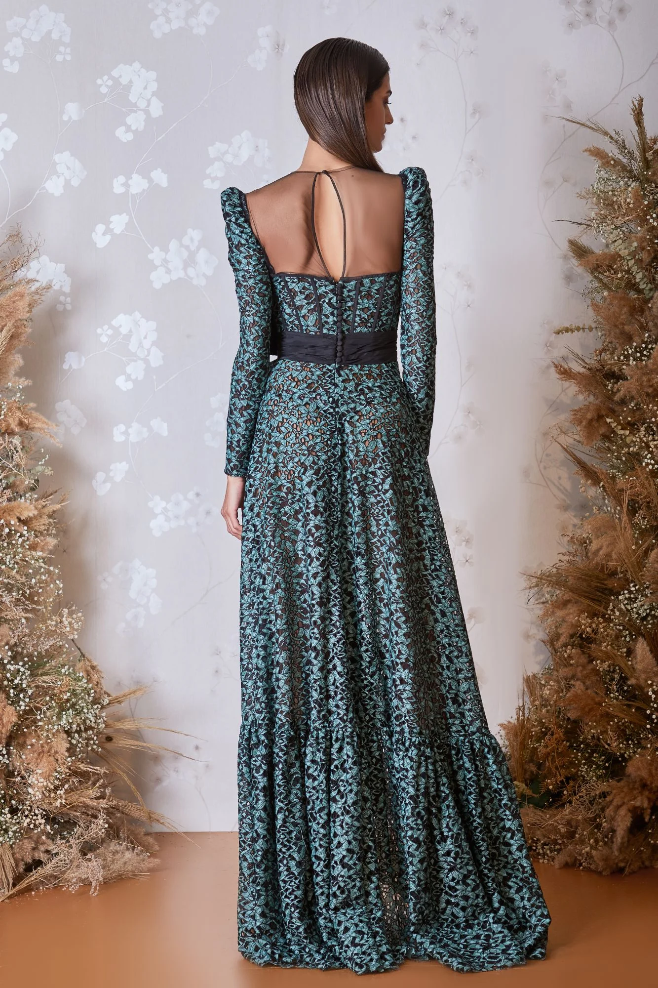 Illusion neck, hollowed dress with boning bodice, long sleeves waist ribbon and high-low flare skirt.