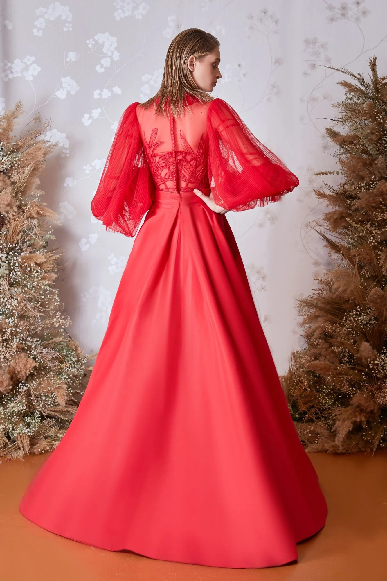 High ruffled neck mini dress with boning lace semi-sheer bodice, puffed loose long sheer banded sleeves and lined mini lace skirt. Comes in on an A-line cascading ruffled slit flare skirt with waist ribbon.