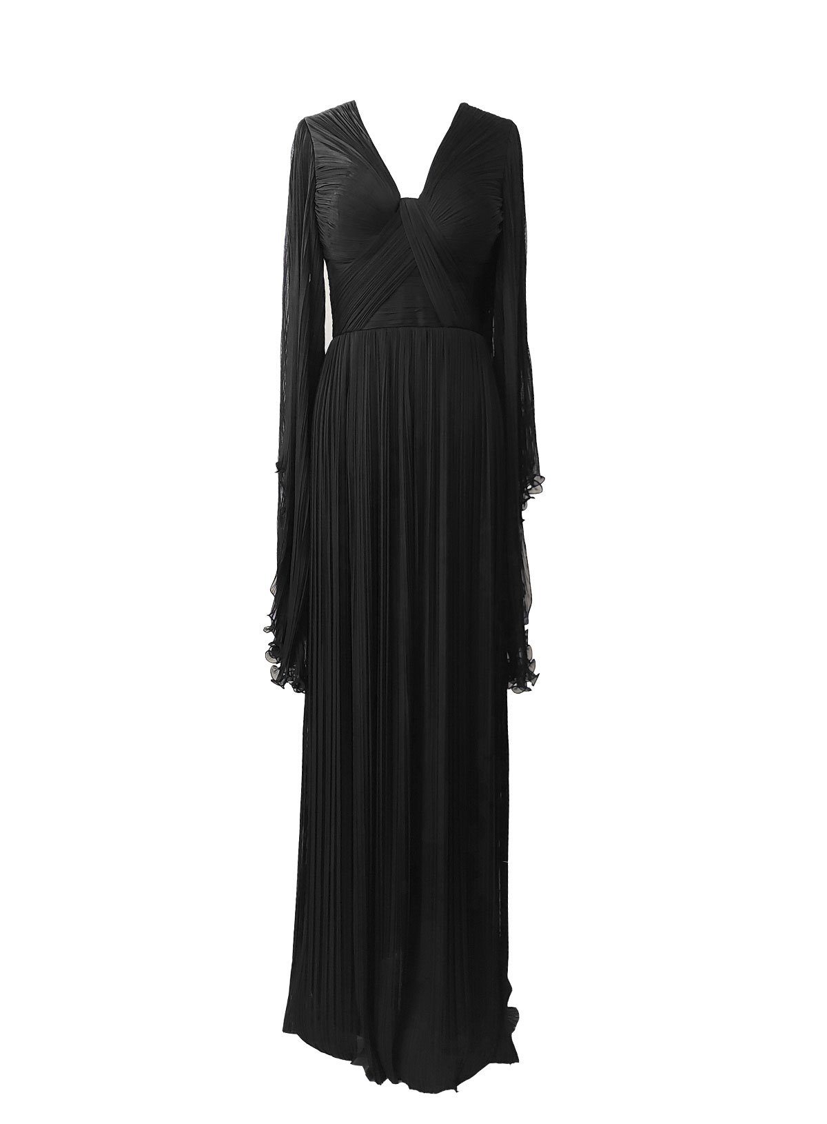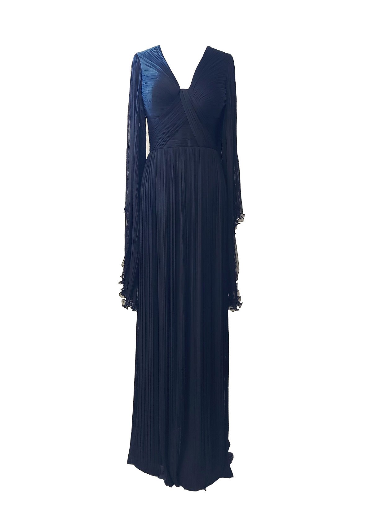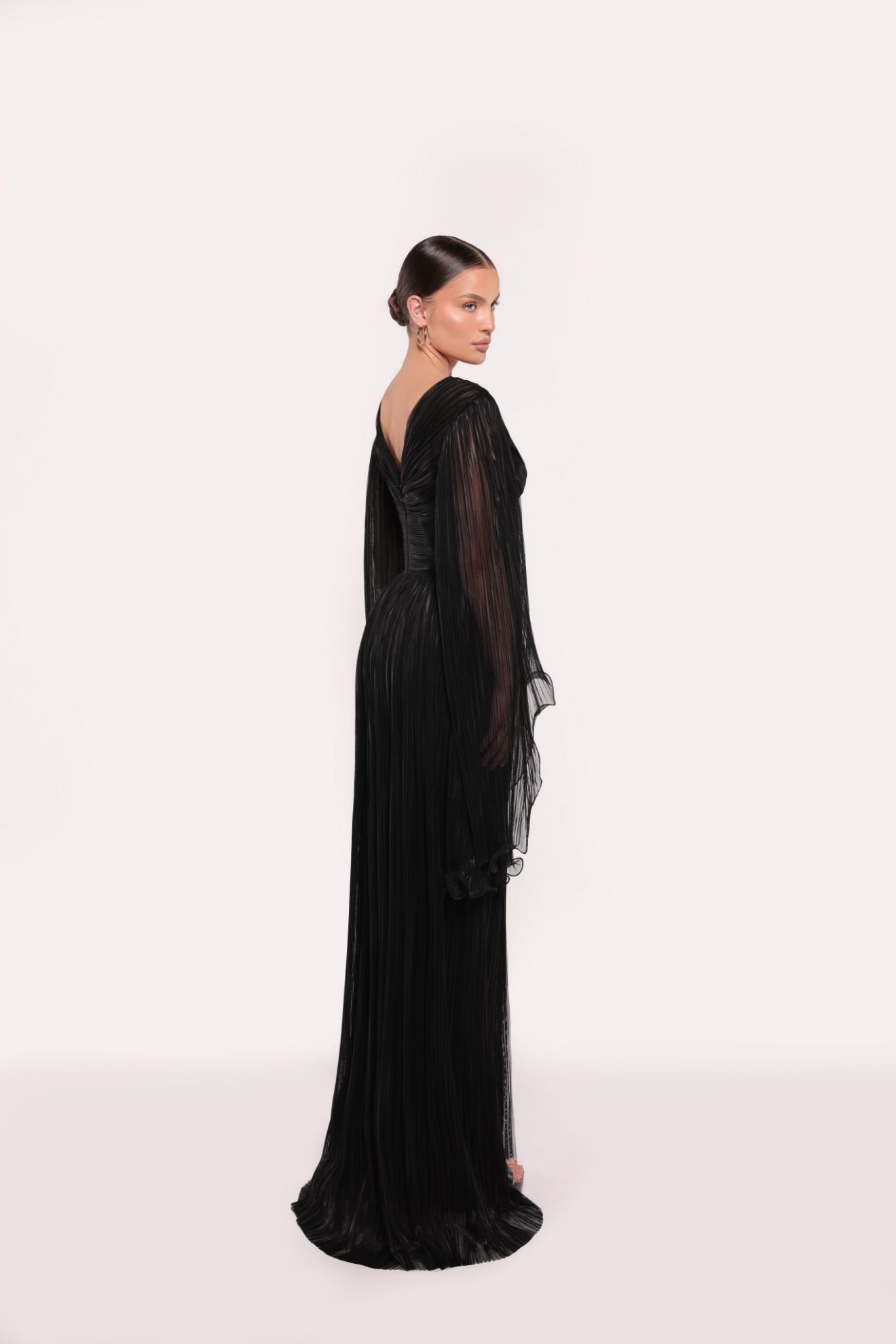 Elegant and dramatic, our dress features voluminous tulle pleats, a V-neckline, and structured shoulders. With asymmetrical detailing at the bust and a daring slit, it exudes modern sophistication. The statement cape sleeves add a touch of grandeur to this striking ensemble, ensuring you command attention at any event.
