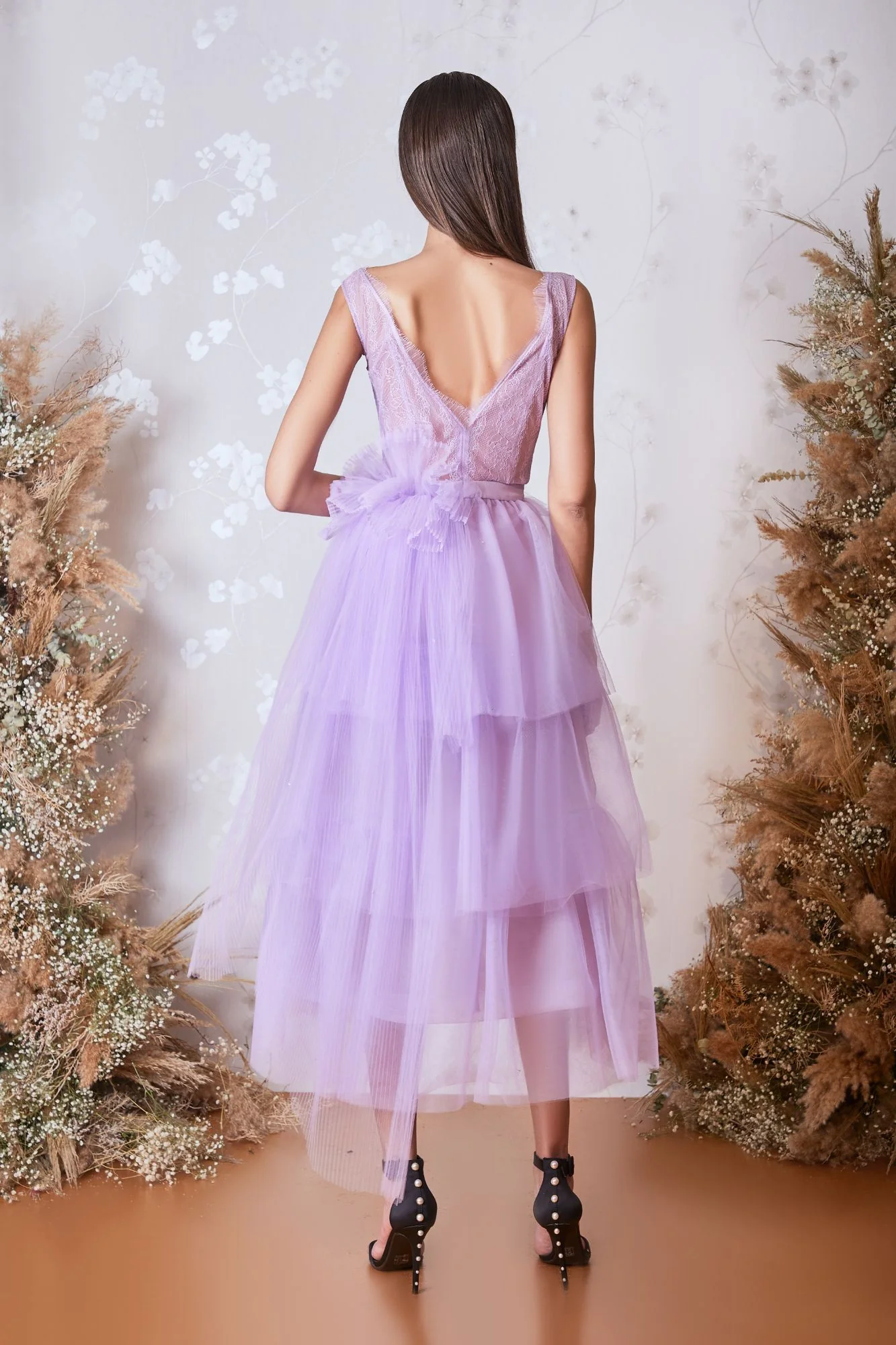 Deep V-neck tulle dress, boning bodice with ruffled waist, mini round skirt comes is on an over high-low ruffled layered skirt.