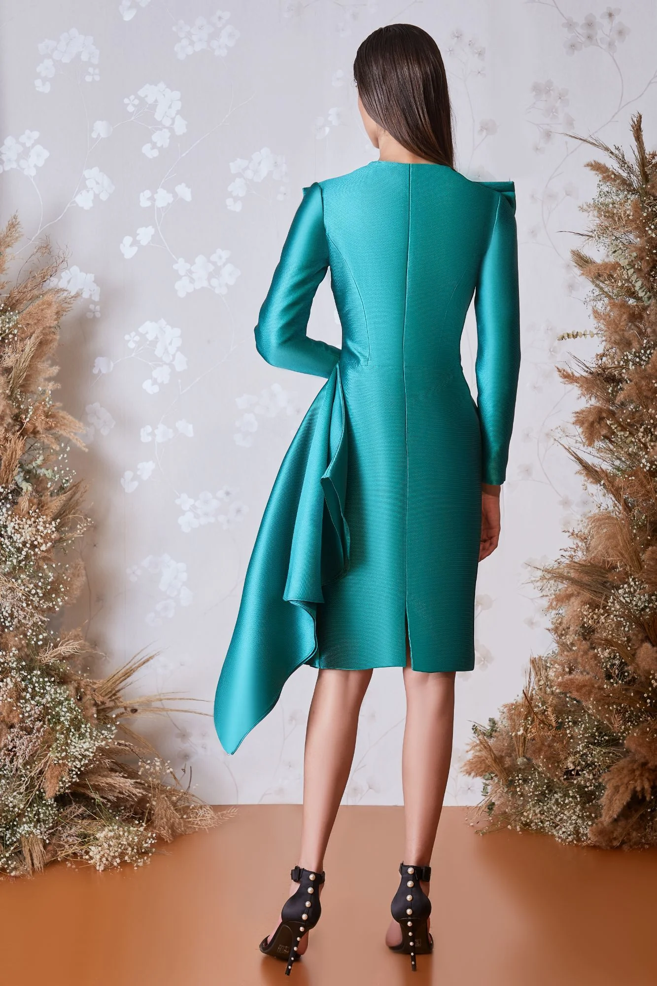 Covered neck, sculpted bodice and plain midi dress with long sleeves and ruffled cascading side skirt with small back slit.