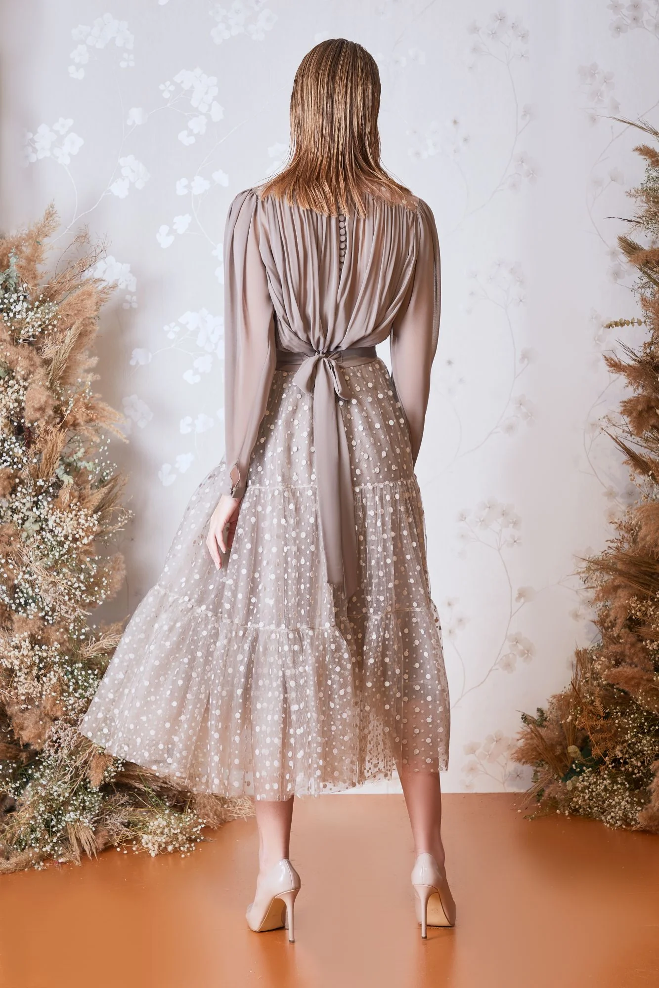 High neck top with sheer dotted tulle garnished with lace, pleated bodice and long sleeves with banded waist node in the back and midi tired dotted skirt.