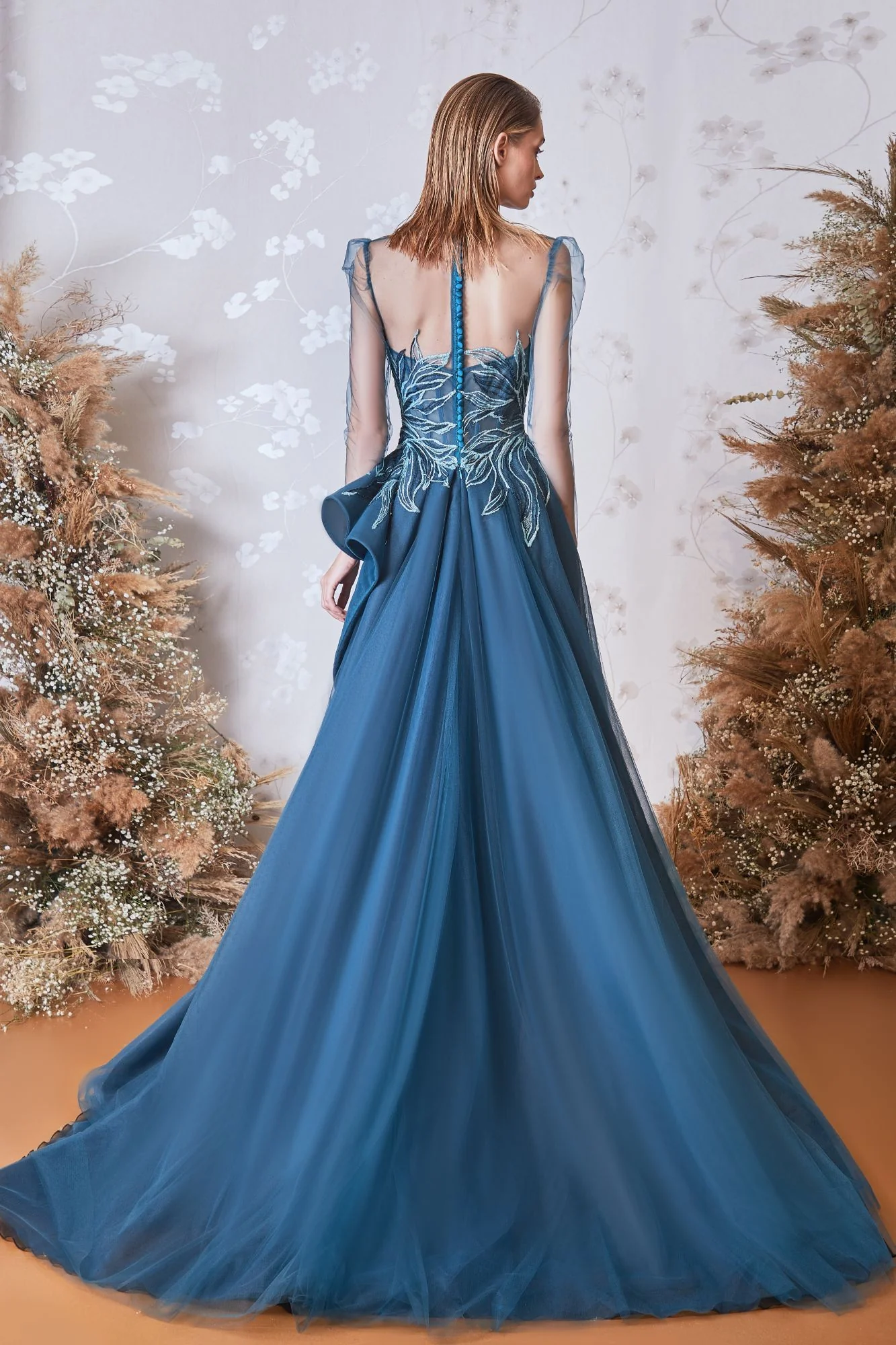 Illusion neck with sheer long sleeves and lace bodice with some spikes, column skirt with lace and cascading slit ruffled side.Ccomes in on a sweep train.