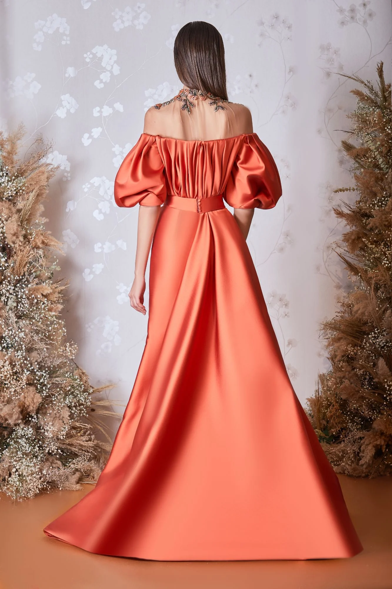 Illusion high beaded swarovski neck with off-shoulders, short puffed pleated sleeves and rushed bodice, banded waist with asymmatrical slit skirt and train.