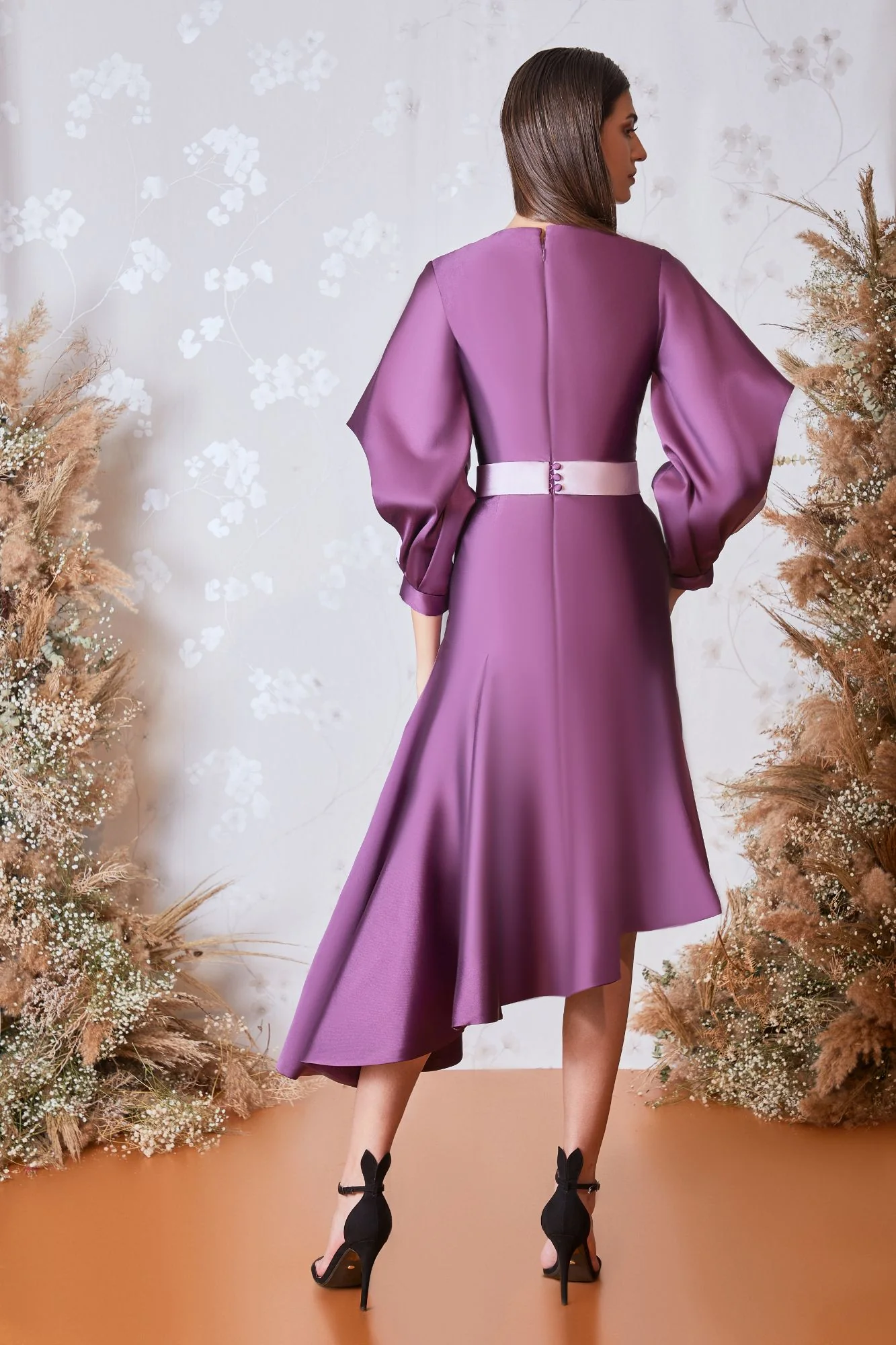 Closed neck with bodice slit, long loose banded sleeves, waist belt and asymmetrical cascading midi skirt.