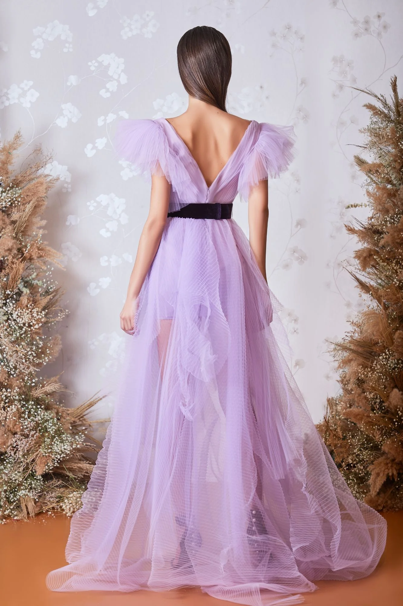 V-neck tulle dress with ruffled shoulders, rushed bodice, banded velvet waist and mini skirt comes in on an overkirt with asymmetrical ruffled layers.