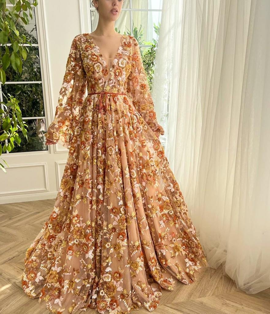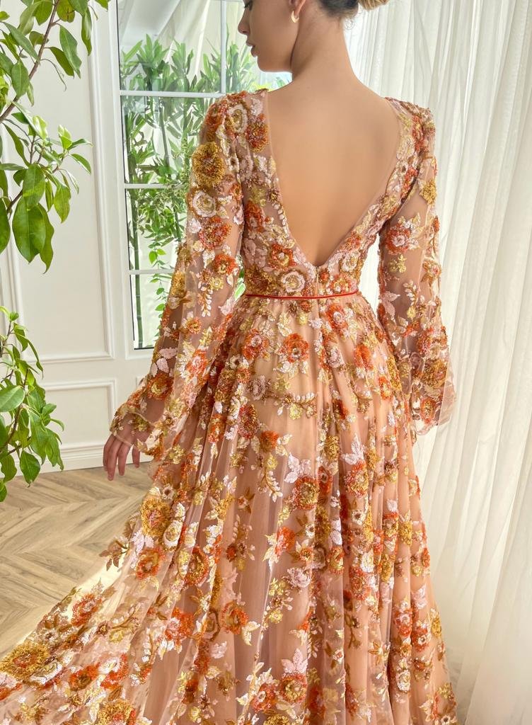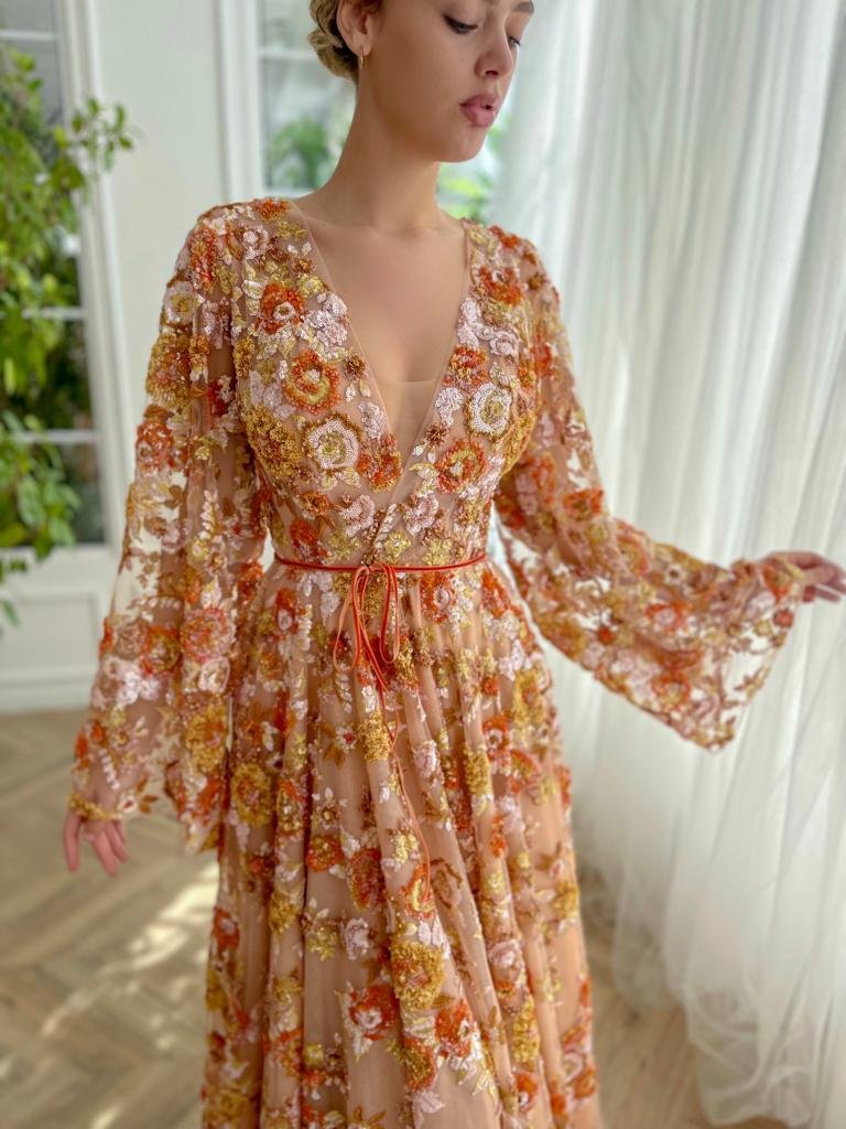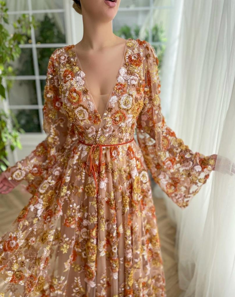 Experience the essence of fall with a dress adorned with embroidered autumnal sequined blooms on delicate lace fabric. Boasting a flattering V-neckline that seamlessly transitions into a wrap top, its A-line silhouette gracefully descends to a floor-length finish, further enhanced by a court train. Designed with functionality in mind, the gown features inseam pockets and is accentuated with funnel sleeves. A decorative ribbon belt cinches the waist, adding the perfect finishing touch to this embodiment of seasonal elegance and sophistication.