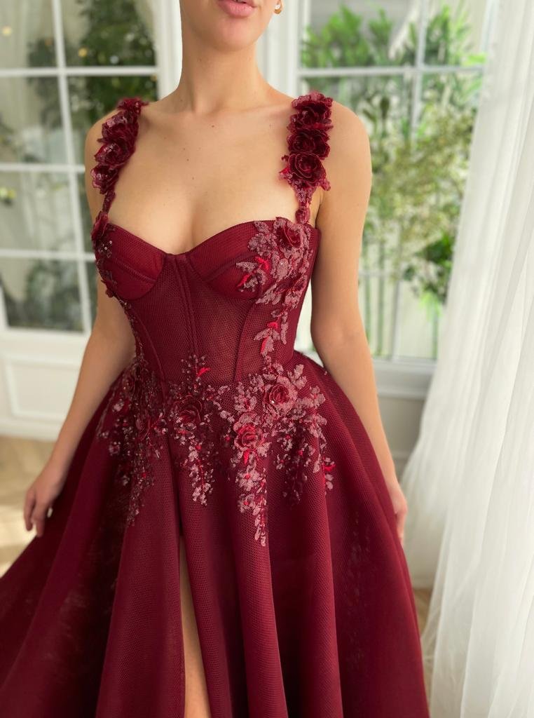 Step into a world of elegance with this mesmerizing maroon gown, where each detail blooms with sophistication. Enveloped in delicate mesh-net fabric, this dress is a testament to intricate craftsmanship, showcasing a stunning tapestry of floral motifs and leaves embroidered along the sweeping skirt. The bustier corset, thoughtfully designed with built-in pads and boning, sculpts a refined silhouette, complemented by a cinched waist that cascades into an A-line, floor-length skirt. Its leg slit adds a touch of allure, balanced by the whimsy of blossom-designed straps. Functional yet chic, the inseam pockets are a nod to modern practicality. This dress is not just a garment; it's a garden of elegance for your most memorable occasions.