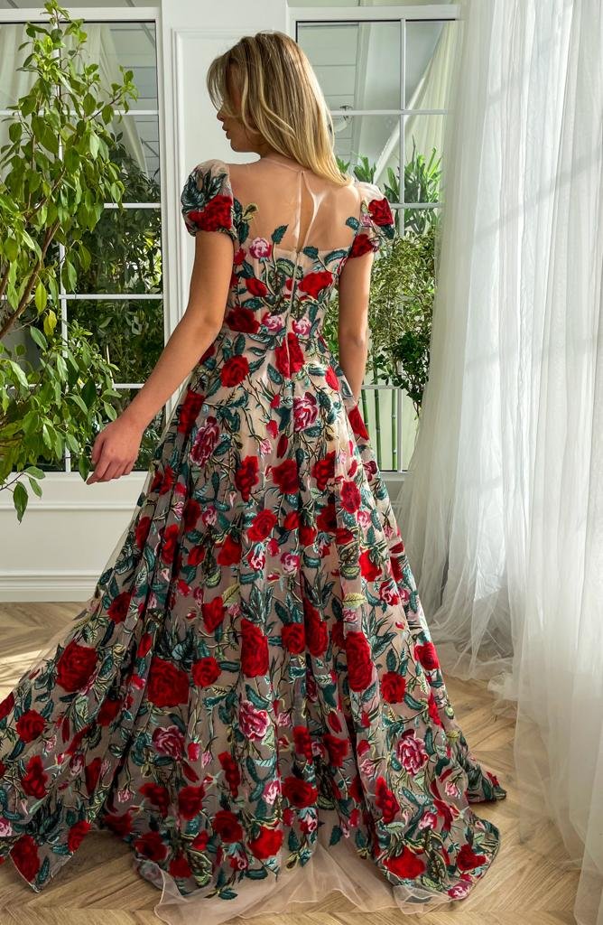 Embrace timeless elegance with our enchanting floor-length dress, a symphony of romance and sophistication. This masterpiece is adorned with a vibrant array of radiant red roses and lush foliage, elegantly juxtaposed against a delicate layer of nude tulle, creating a mesmerizing visual feast. The round neckline offers a classic touch, while the short puffy sleeves add a hint of whimsy. Designed to accentuate your silhouette, the dress features a cinched waist flowing into a flattering A-line cut that gracefully sweeps the floor, culminating in a charming sweep train. Practicality meets style with discreet inseam pockets, making this dress not only a stunning visual statement but also a comfortable and functional choice for any special occasion.