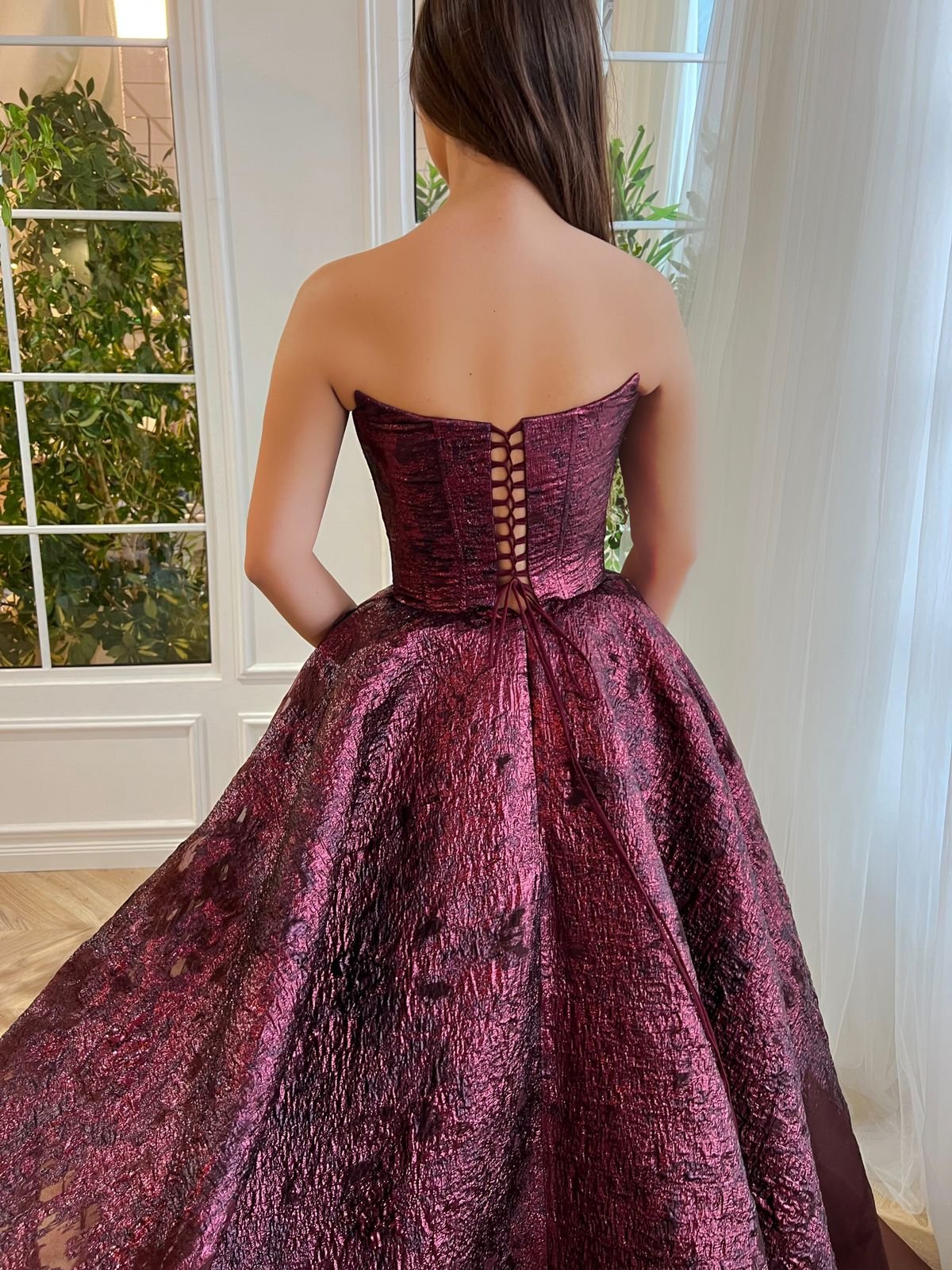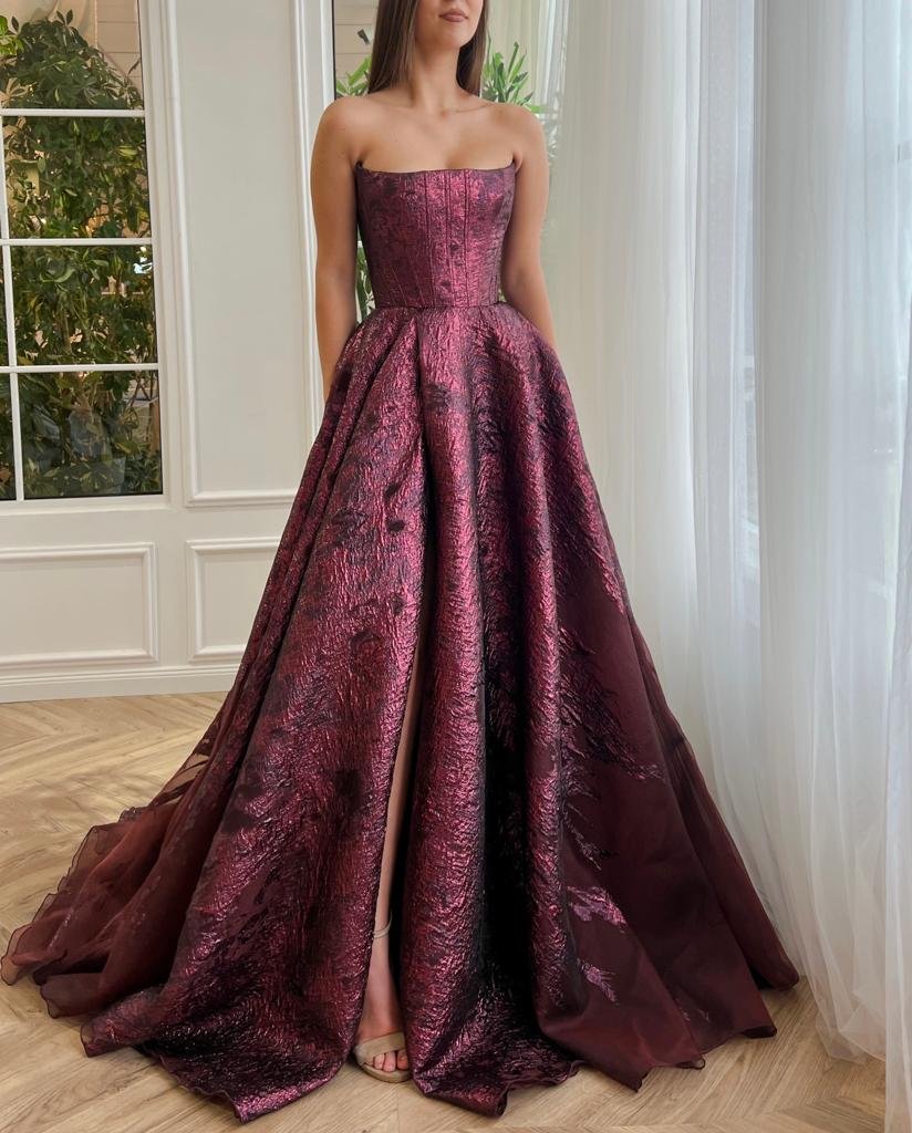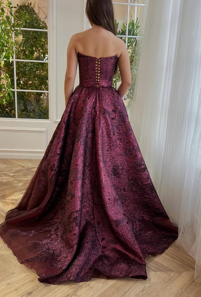 This exquisite maroon bordeaux dress is the epitome of timeless elegance and modern sophistication. Crafted from a rich tapestry of brocade fabric, it's accented with delicate organza for an ethereal touch. The bodice is a masterpiece of design, meticulously structured with full boning to contour and flatter the figure, complemented by a strapless neckline that adds a touch of classic allure. The dress cascades into a stunning A-line silhouette, featuring a full, dramatic skirt that promises to turn heads. A daring leg slit adds a modern edge to the timeless design, while inseam pockets offer a blend of functionality and style. The floor-length skirt flows gracefully, creating a mesmerizing movement with every step. Completing this breathtaking ensemble is a lace-up back, ensuring a perfect, customizable fit. This dress is not just a garment but a statement piece that celebrates the fusion of tradition and contemporary fashion.