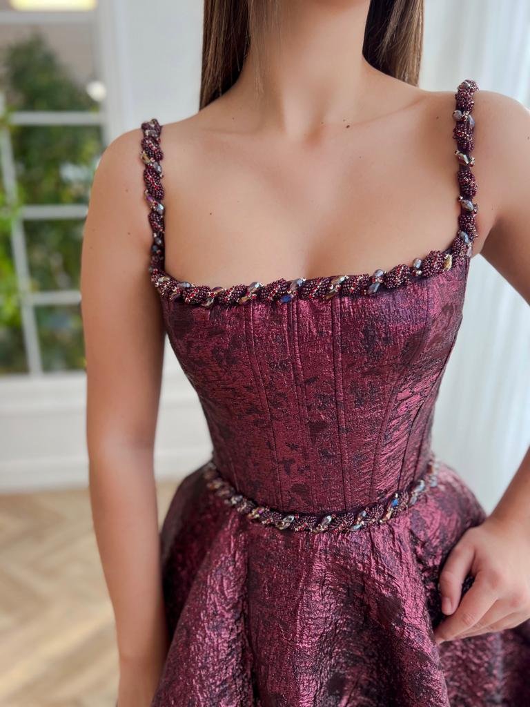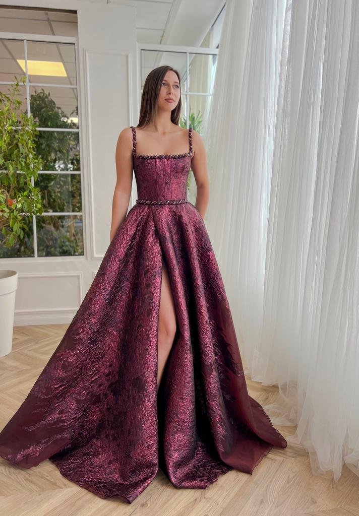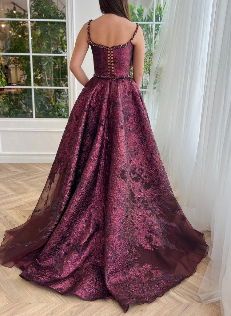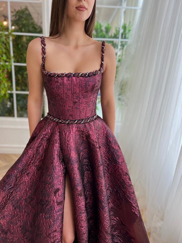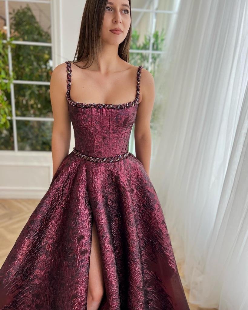 Introducing our latest masterpiece, a dress that harmoniously blends timeless elegance with modern sophistication. This exquisite piece showcases a breathtaking tapestry of bordeaux brocade embroidery, each stitch intricately woven to create an alluring sense of depth and texture. The fully boned corset cinches gracefully at the waist, leading to a square neckline bodice that radiates classic charm. The dress's A-line silhouette, renowned for its universally flattering appeal, gracefully contours to any figure, promising an effortlessly stylish look for any occasion. Adding a hint of daring allure, a tastefully placed leg slit enhances the silhouette, perfect for showcasing your confidence. For added convenience, the dress features seamlessly integrated inseam pockets, merging functionality with fashion. Completing this enchanting ensemble is a lace-up back, providing an adjustable fit while adding a touch of romantic flair. This dress is not just an outfit; it's a statement of elegance and style.