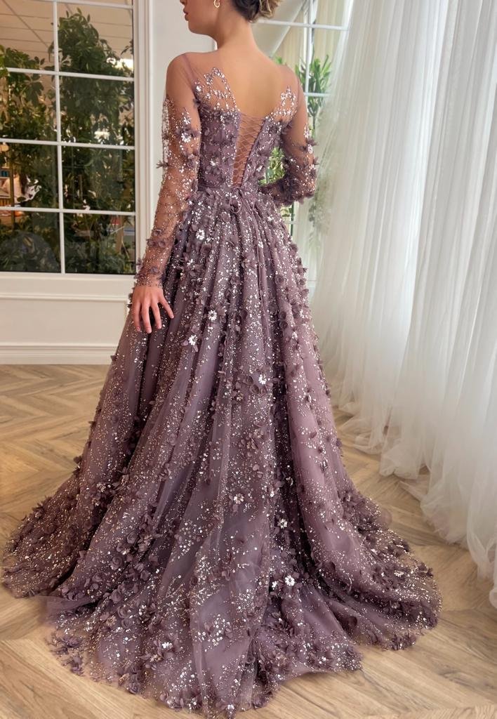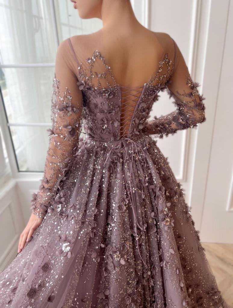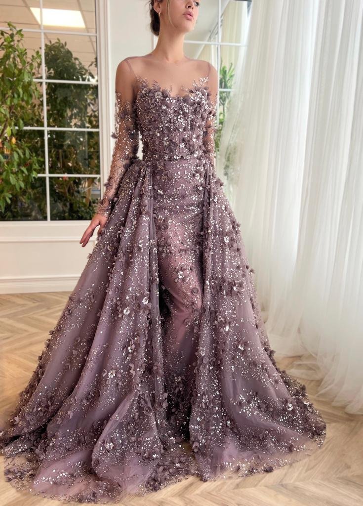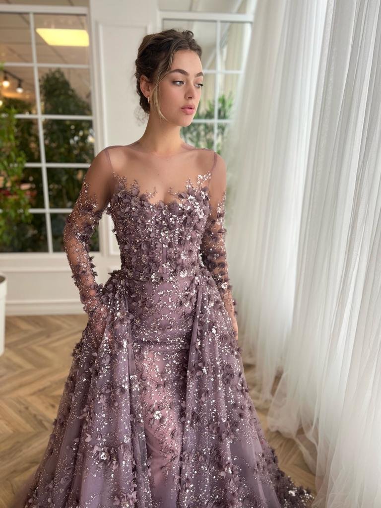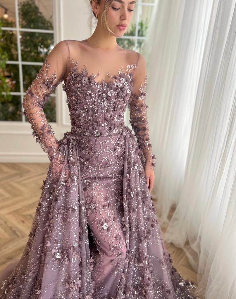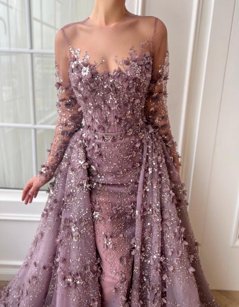 This dress features a lilac lace fabric flourishing with embroidered blooms, offering a blend of elegance and floral charm. It's meticulously crafted, overlaid with hand-applied embellishments that catch the light and draw the eye. The unique round-blouse style neckline is elegantly layered to form a heart-shaped top, adding a romantic touch. The fitting bodice is designed with boning to enhance and flatter the figure, while the cinched waist leads to a mermaid silhouette. An optional overlay skirt and a dramatic train add versatility and grandeur to the dress. Tight-fit long sleeves bring a sophisticated edge, and the lace-up back ensures a perfect, adjustable fit. This dress is a fusion of artisanal skill and style, ideal for making a memorable impression at any upscale event.