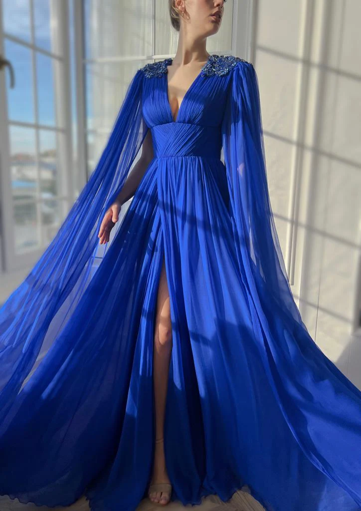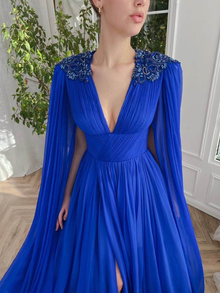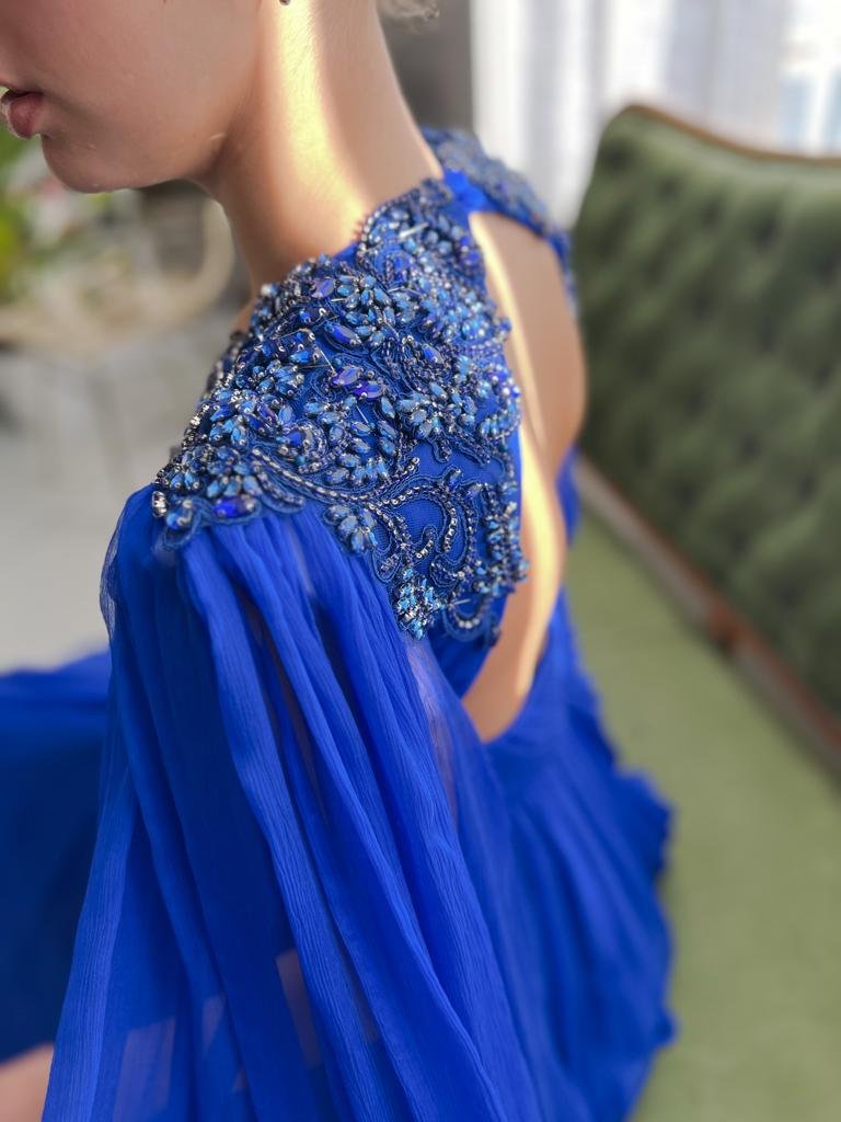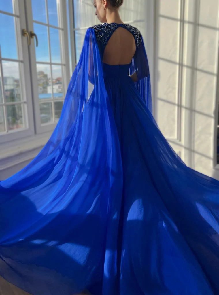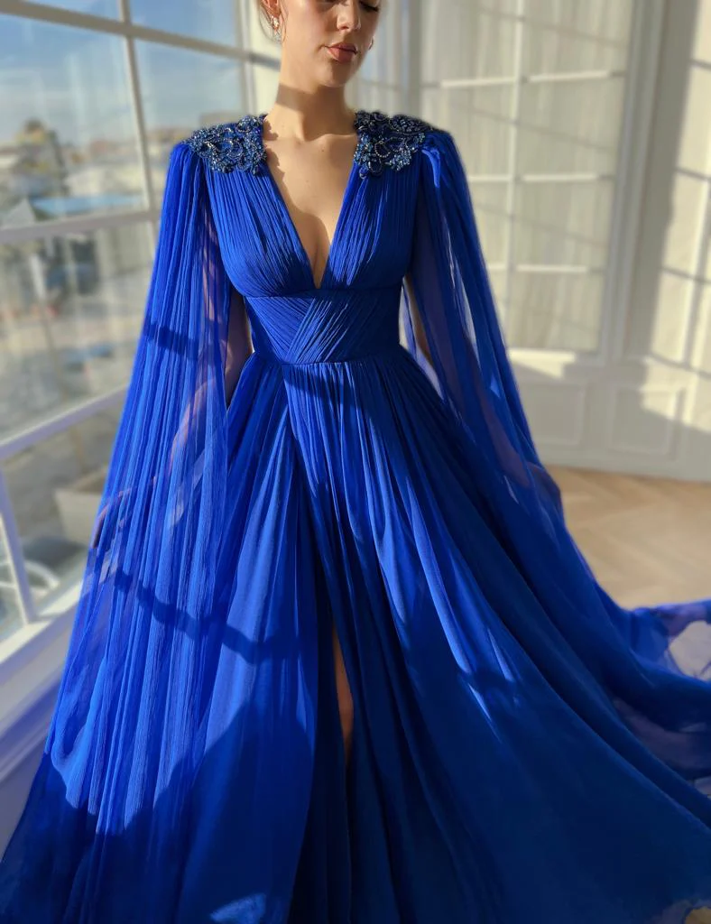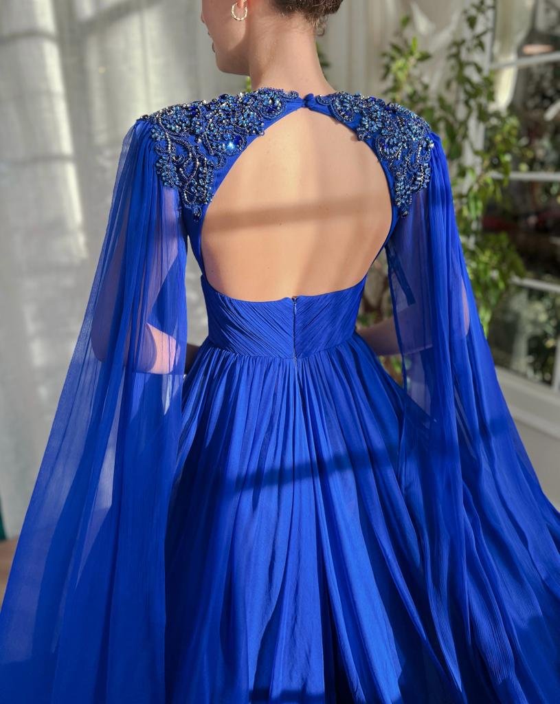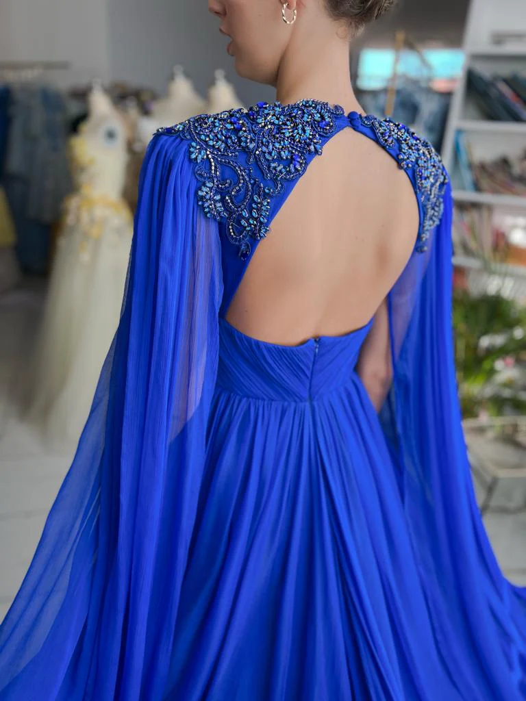 This exquisite gown, crafted from premium blue silk, exudes elegance and sophistication. Its narrow V-shaped neckline gracefully accentuates the décolletage, leading to a beautifully draped bodice that harmonizes with a cinched waist to create a stunning silhouette. The dress flows into an A-line shape, completed with a court train that adds a touch of royal grace. A tasteful leg slit infuses a hint of allure, while the long, sheer sleeves extend into a captivating cape-like design at the back, adding a dramatic flair. The open-back feature enhances the gown's allure, perfectly complementing the intricate crystal embellishments that adorn the shoulders and back. These crystals catch and reflect light in a mesmerizing display, ensuring that every movement is a sparkling statement of style and sophistication. This gown is not just a dress, but a masterpiece of design, perfect for making a lasting impression at any elegant event.