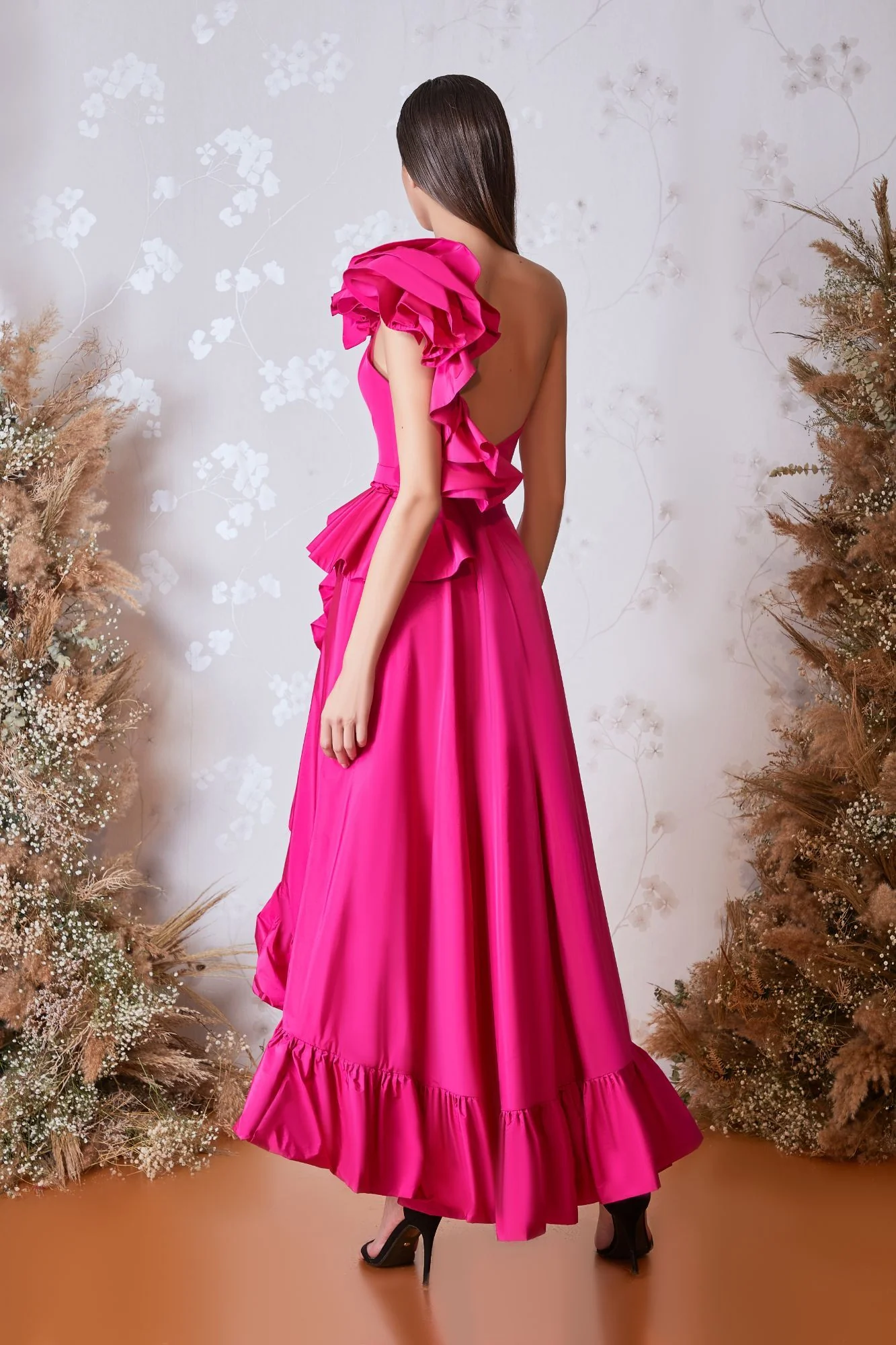 One ruffled shoulder with sweetheart bodice, waist belt and wrap high-low ruffled skirt.